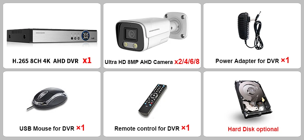 1 х 8-канальный H.265 AHD 4K DVR NVR HVR 6 в 1 цифровой видеорегистратор;2/4/6/8 x HD 8.0MP для дома и улицы ИК Full Цвет Ночного Видения Всепогодные камеры;1 х адаптер питания для DVR;1 X USB мышь для DVR;1 компакт-диск программного обеспечения для DVR;1 пульт дистанционного управления для DVR;Жесткий диск опционально!Видео кабель в комплект не входит!
