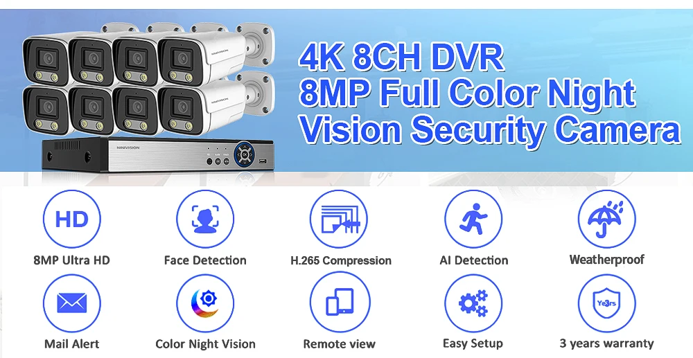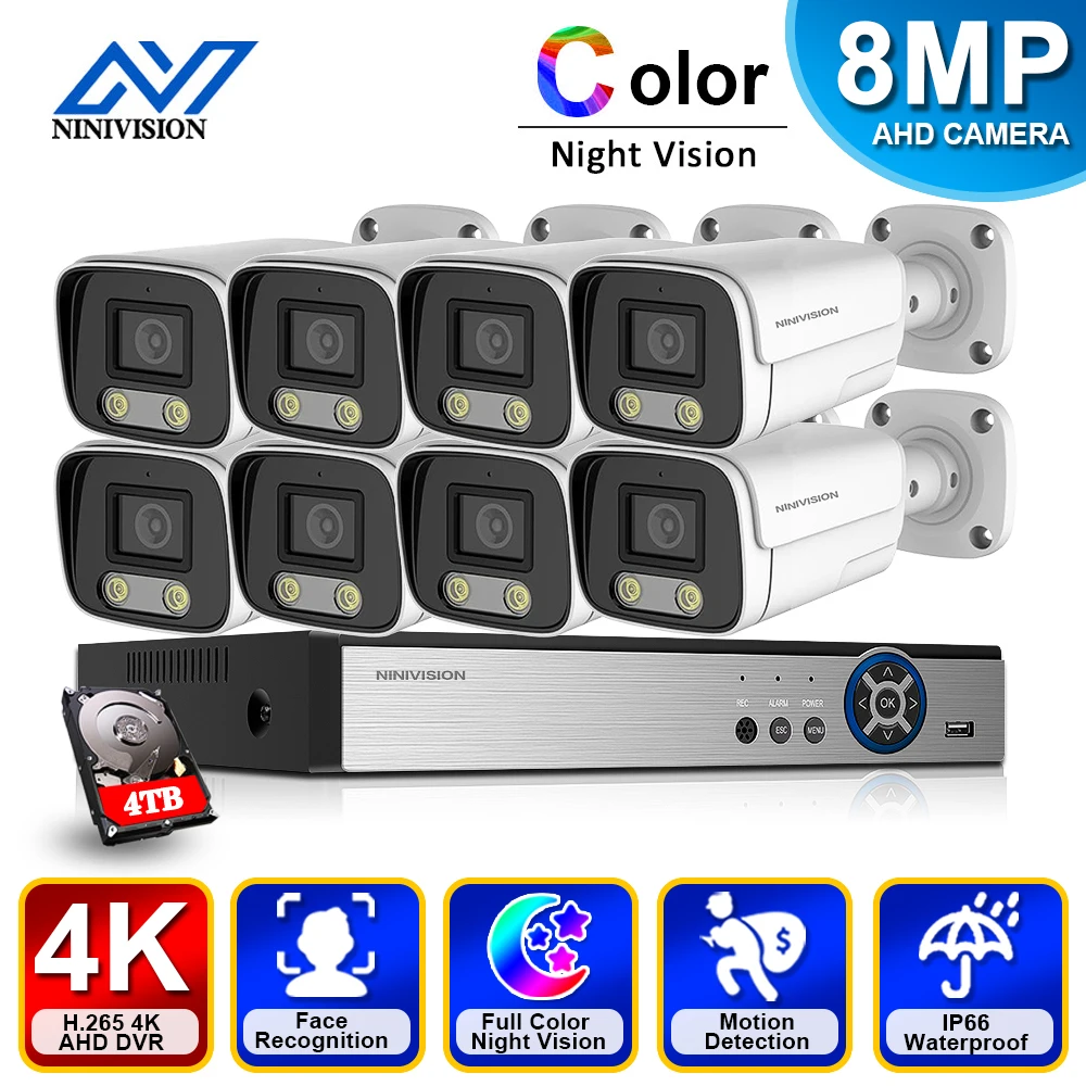 NINIVISION CCTV система безопасности комплект 8MP 8ch DVR 8MP цветной полный ночного видения AHD водонепроницаемый распознавание лица камера видеонаблюдения