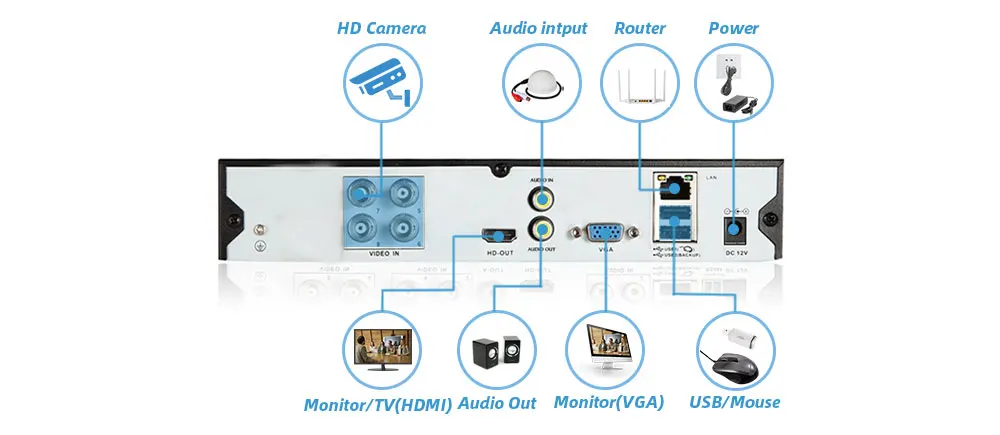 Просмотр на мониторе HDMIЛегко отображать видео через порт HDMI вашего монитора компьютера, чтобы в полной мере воспользоваться ясностью системы безопасности. (Кабель HD не входит в комплект)Просмотр по телевизору или монитору ПКДля дополнительного удобства видеорегистратор также поставляется с разъемами VGA и BNC для стандартных вариантов просмотра разрешения. (кабель VGA или BNC к RCA не входит в комплект.)