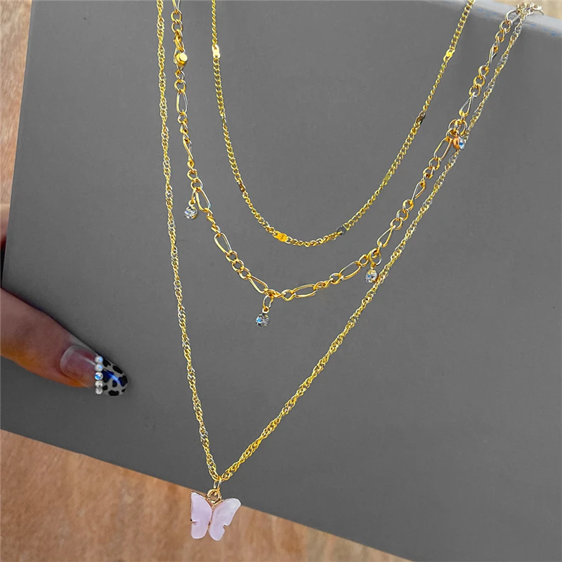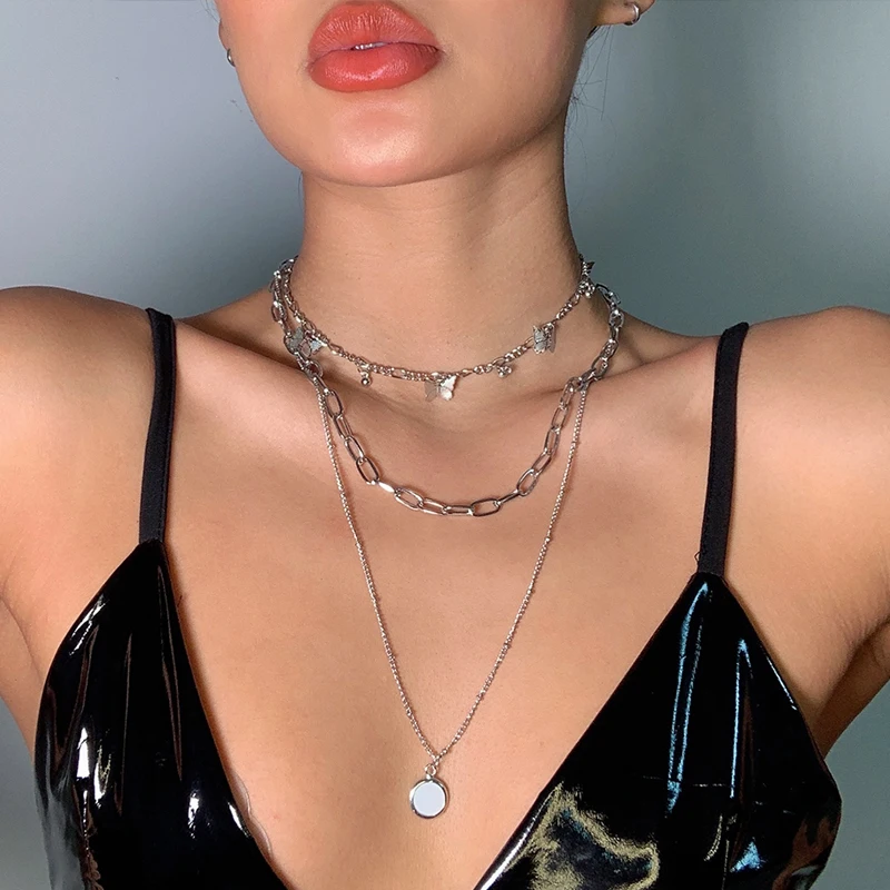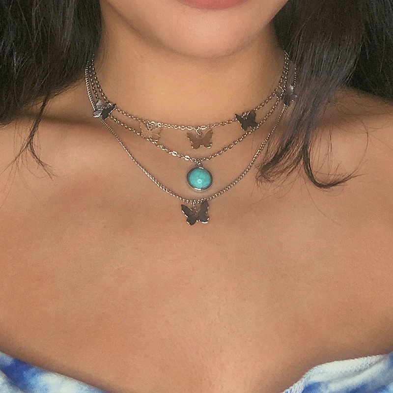 Женское многослойное ожерелье с подвеской-бабочкой, серебристого цвета