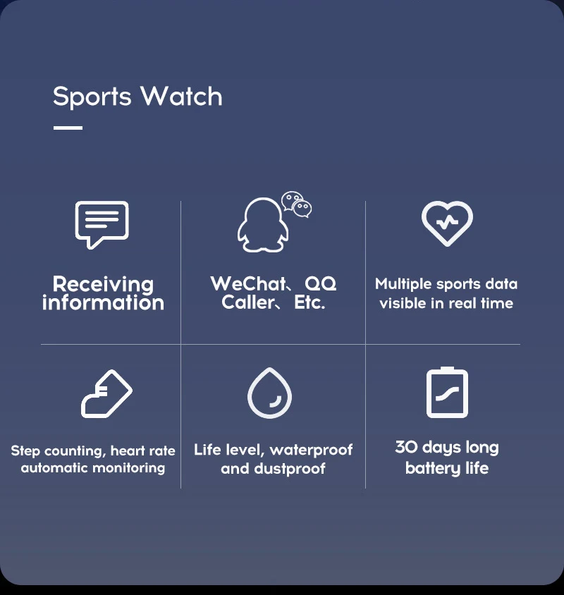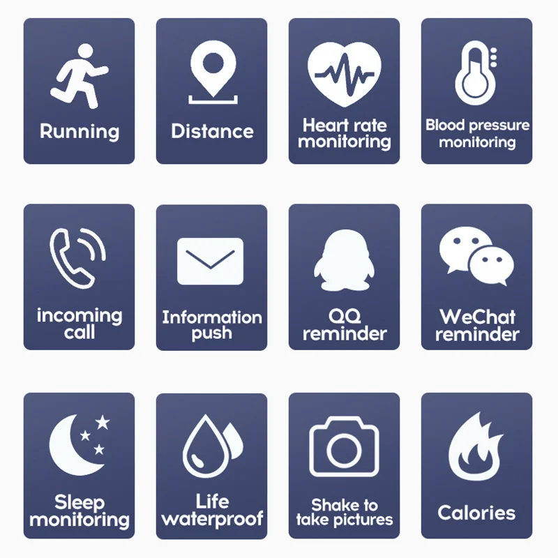 1. Поддержка Bluetooth 4,0, Android , IOS 2. Сенсорный экран для управления наручными часами 3. Шаги, калории, расстояние: при упражнениях, он может записывать количество шагов, сожженных калорий, траекторию бега и расстояние до места назначения. 4. Монитор сердечного ритма: он будет точно контролировать и записывать ваш пульс. 5. Монитор артериального давления: он будет точно контролировать и записывать ваше кровяное давление. 6. Монитор сна: во время сна, он может контролировать время и качество сна. 7. Напоминание о сидячем положении: Установите время напоминания о сидячем положении, оно будет вибрировать, чтобы напомнить вам об отдыхе. 8. Будильник 9. Дистанционное управление фотографией: в пределах 10 метров, вы можете встряхнуть его, чтобы управлять телефоном, чтобы делать фотографии. 10. Напоминание о сообщениях и звонках: когда телефон получает звонок или сообщение, он будет вибрировать, чтобы напомнить вам. 11. 10 дней в режиме ожидания.