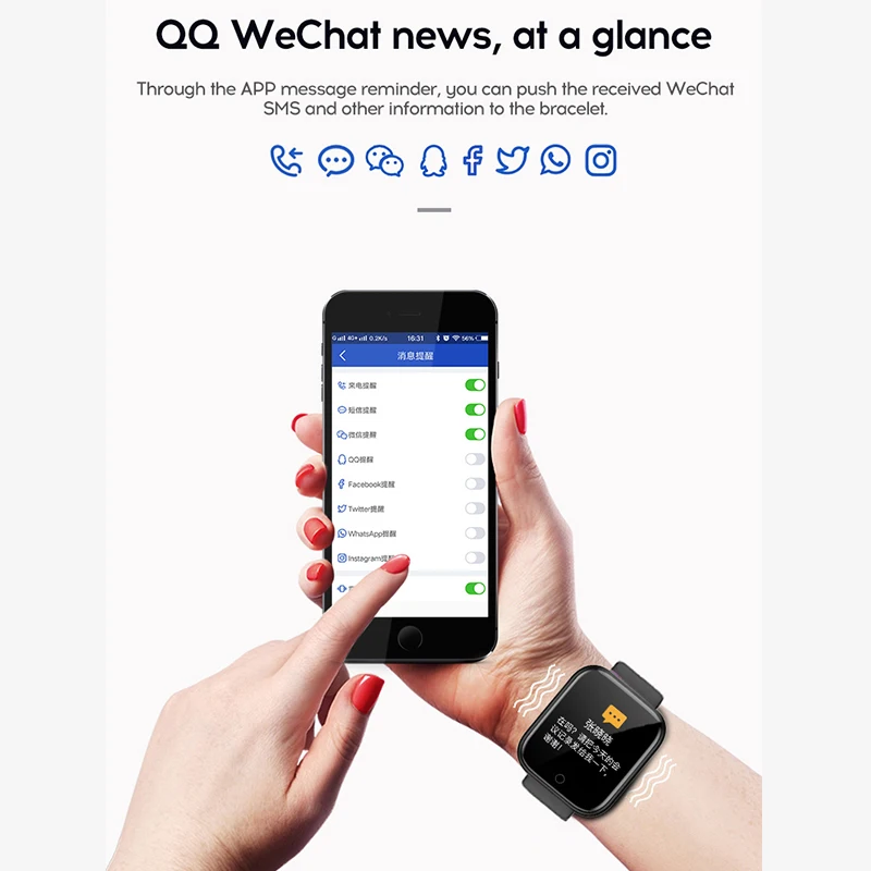 Через приложение напоминание о сообщениях, вы можете нажать на полученную WeChat SMS и другую информацию на браслет