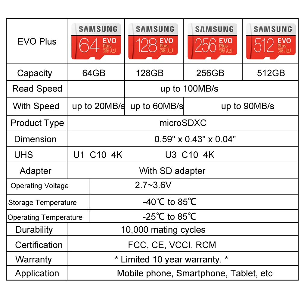 Карта памяти MicroSD SAMSUNG EVO Plus, 512 ГБ, 256 ГБ, 128 ГБ, A2, V30, U3, 130, МБс., C10, U1, TF-карта, 64 ГБ, V10, A1