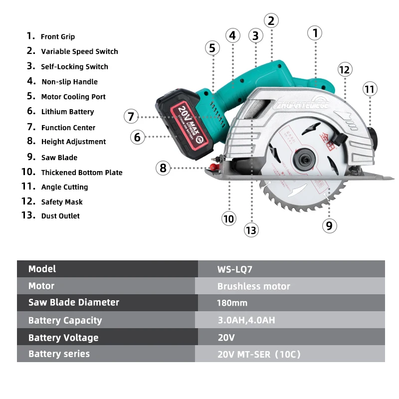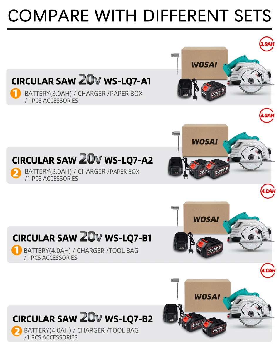 WOSAI 7 дюймов бесщеточная циркулярная пила 20 в электрическая пила Беспроводная циркулярная пила для резки пилы Деревообрабатывающие инструменты MT-SER