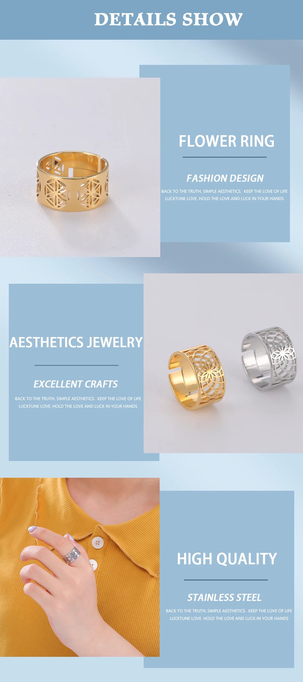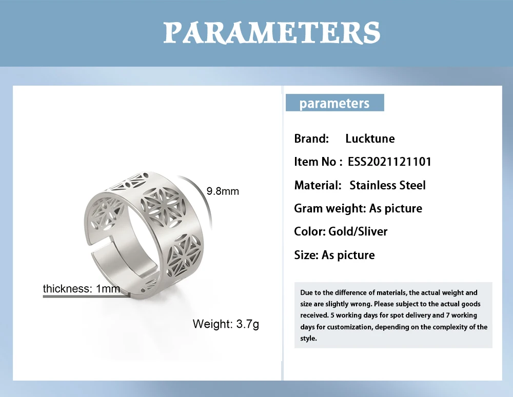 Наименование товара: кольцо с цветком жизниСостояние: 100% новый брендМатериал: нержавеющая стальЦвет: серебристый/золотой/розовое золотоРазмер: как на картинкеВес: 3,7 гКоличество: 1 шт., посылка не включает заводскую бумажную информацию.