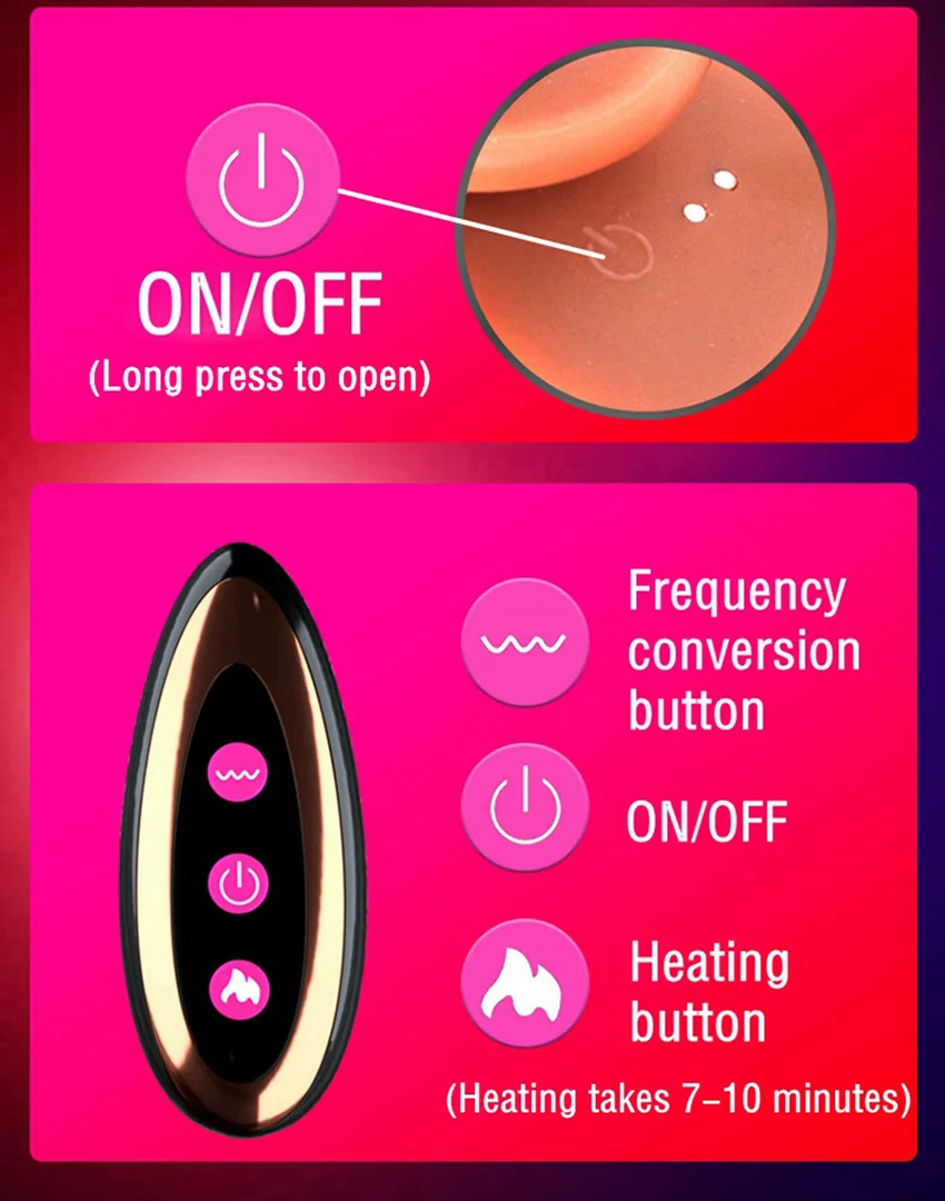 Шаг 4: если вы хотите нагревать (Примечание: нагревательная часть находится в верхней части pseudopenis), вам нужно нажать кнопку нагрева, которая занимает 7-10 минут или более. При использовании в холодную погоду, пожалуйста, нагрейте его в течение более длительного времени, чтобы достичь желаемого эффекта нагрева, максимальная температура составляет 42 градусов. Долго нажимайте клавишу нагрева, чтобы закрыть нагрев