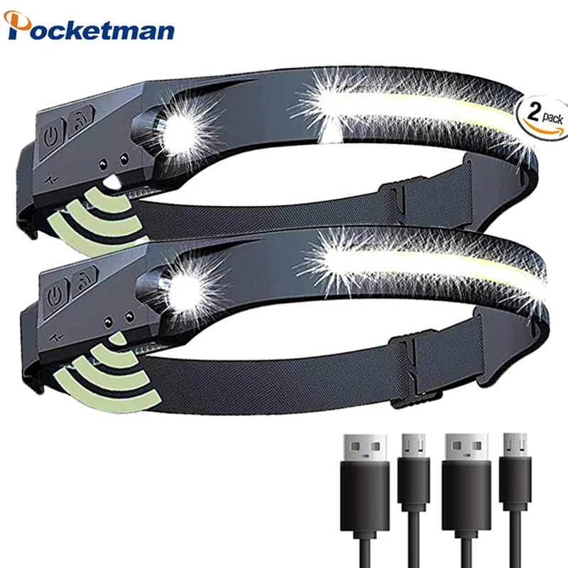 Светодиодный налобный фонарь COB с зарядкой от USB, водонепроницаемый Головной фонарь со встроенным аккумулятором, Головной фонарь с датчиком движения