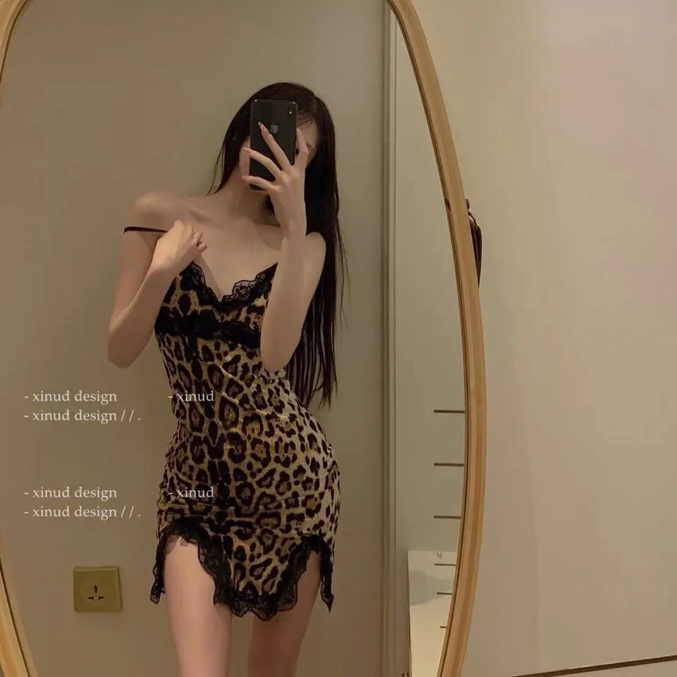 Женская сексуальная пижама, леопардовое Ночное платье с V-образным вырезом, женское кружевное нижнее белье в стиле ночного клуба на бретельках, женская пижама