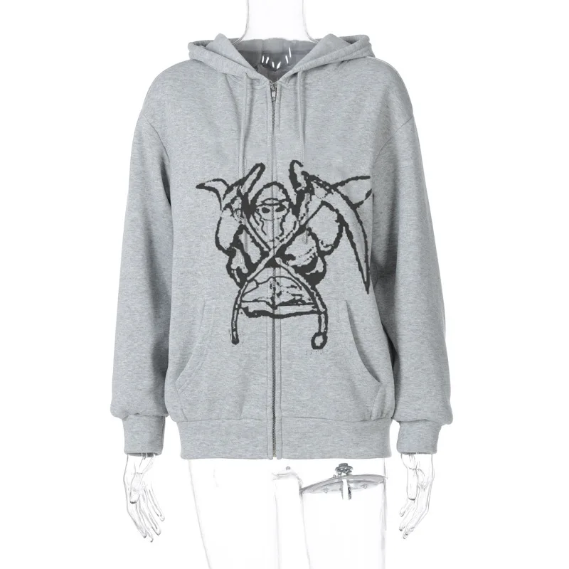 Y2K Эстетическая толстовка на молнии в стиле Харадзюку 90-х годов, топ на молнии с винтажным графическим принтом, свитшоты для E-girl на весну и осень