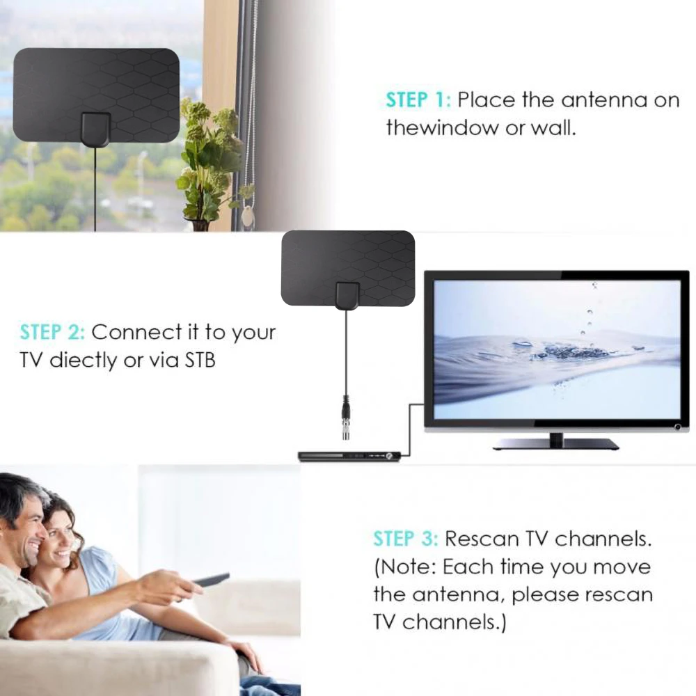 Сколько бесплатных каналов вы можете получить?Dtv.gov/maps: Узнайте, где расположены вещательные башни в вашем регионе.Антенна веб: Узнайте, сколько бесплатных каналов доступно у ваших местных вещателейПредоставляет списки доступных каналов, карты покрытия и карты анализа динамического сигнала для любого местоположения.Пожалуйста, обратите внимание!1. Если у вашего телевизора нет встроенного тюнера, необходимо установить телеприставка для прослушивания сигналов HD TV.2. Если сигнал не удовлетворяет или доступно только несколько каналов, попробуйте подключить усилитель. Держите телевизионную антенну вдали от источников помех, держите телевизионную антенну вдали от таких больших устройств энергопотребления, как кондиционер, Лифт, Фен и микроволновая печь и т. Д. Зоны с большими препятствиями, такими как долины, горы, здания и т. Д.3. Сила сигнала антенны может варьироваться в зависимости от расстояния от башни, местности и погоды. При необходимости Установите антенну в другом месте. Лучше всего, чтобы антенна была в прямой видимости с ТВ-башней и избегайте препятствий. Всегда повторно Сканируйте каналы после перемещения антенны.