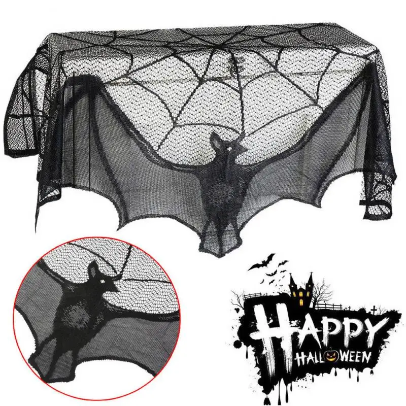 Черная кружевная скатерть на Хэллоуин с бахромой, черепом, летучей мышью, тюлевой Топпер, шаль на Хэллоуин, дом с привидениями, искусственная ткань, скатерть