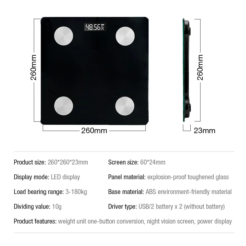Описание:Состояние на 100% абсолютно новыйМатериал: закаленное стеклоЦвет: черный, белыйРазмер: 26x26 см/10,24x10,24 дюймаИсточник питания: 2 батареи AAA (без аккумулятора)Диапазон взвешивания: 0,1-180 кгВесовая единица: кг/фунт, два стиляПосылка включает в себя: 1 шт. * весы для жира (аккумулятор не входит в комплект)Функция:Общее измерение уровня жира в теле: * измерение скорости скелетных мышц * индекс массы тела (BMI) измерение * мышц измерения * измерение влажности * подкожных при полных ногах * Висцеральный жир измерение * белка измерения * измерений калорий • масса костей измерение • Корпус типа измерения * Нормальный Измерение веса • вес без полных ногах * вес тела измерение-справочная информация BMI-сенсорная кнопка