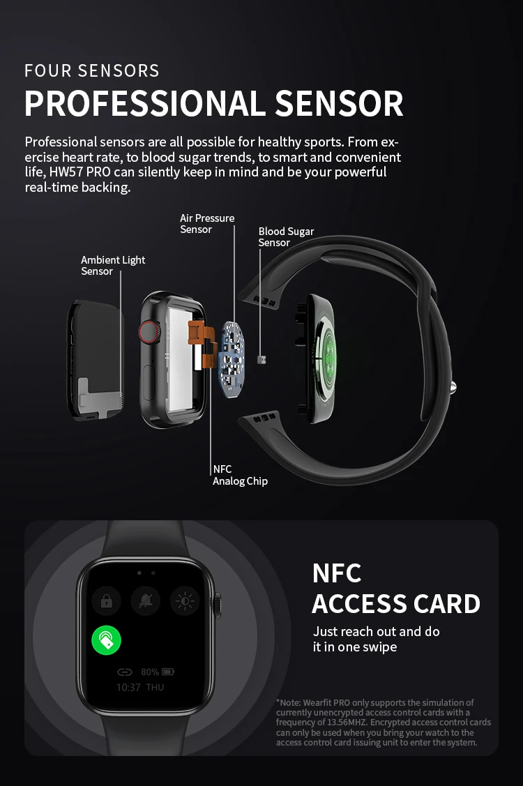 В HW57PRO smartwatch имеет 1,77 дюймов TFT ЖК-дисплей экран с 320x380 Разрешающая способность. Это умные часы с острым экраном с сенсорным экраном. Поддержка беспроводной зарядки, поддержкаNfc Функция, часы могут отправить физическую карту доступа к информации копируется на чип для часов, так что часы могут быть использованы в качестве ключа.