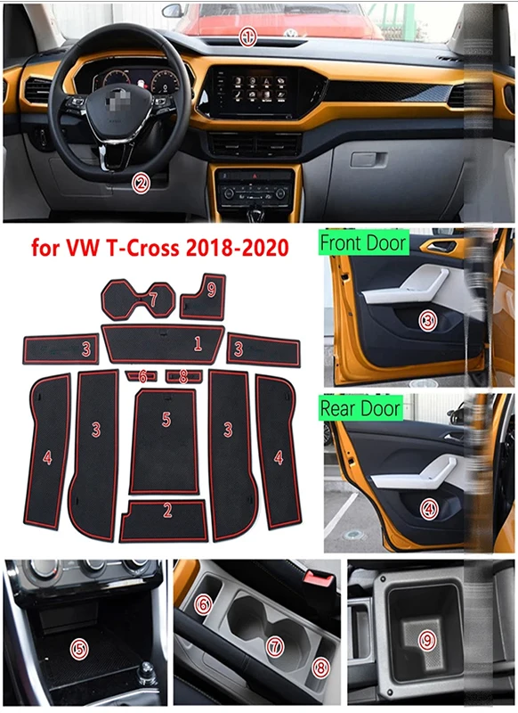 Для Фольксваген Т-кросс 2018 2019 2020 резиновый противоскользящий коврик для двери, паз, подстаканник, слот для ворот, аксессуары для Coaster, подушка для телефона