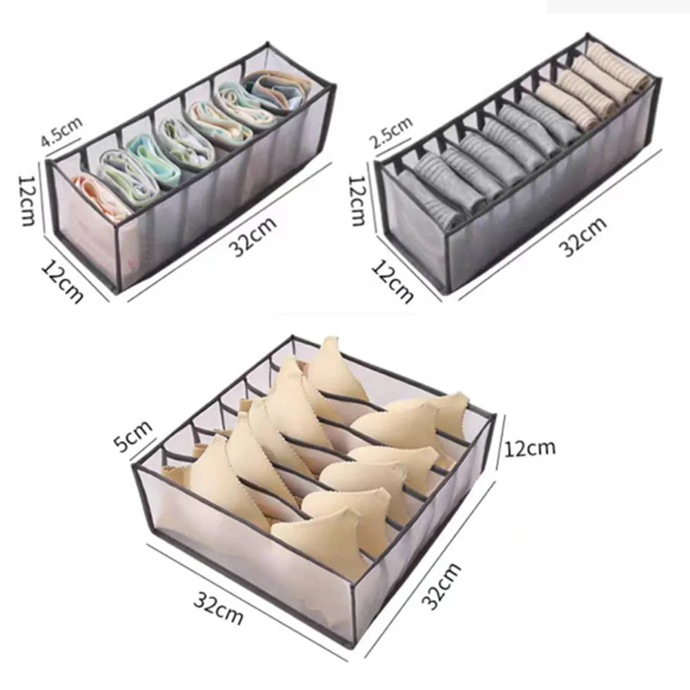Информация о продукте: Цвет: серый, белый Размер: 6 бра с сеткой коробка 12x32x32cm 7 сетчатых трусов 12x32x12cm 11 носки в сетку коробка 12x32x12cm Материал: нейлон Особенности: Храните свои товары с ним быстро и аккуратно, что позволяет легко найти ваш товар Легко складывается, когда не используется, чтобы сэкономить место Изготовлен из нейлоновой сетки, без запаха, моющийся и прочный Подходит для гардеробного шкафа, шкафа или ящика Сортируйте свое нижнее белье, бюстгальтеры, носки, галстуки на шею и т. д. Посылка включает в себя: 1/3 x Коробка для хранения