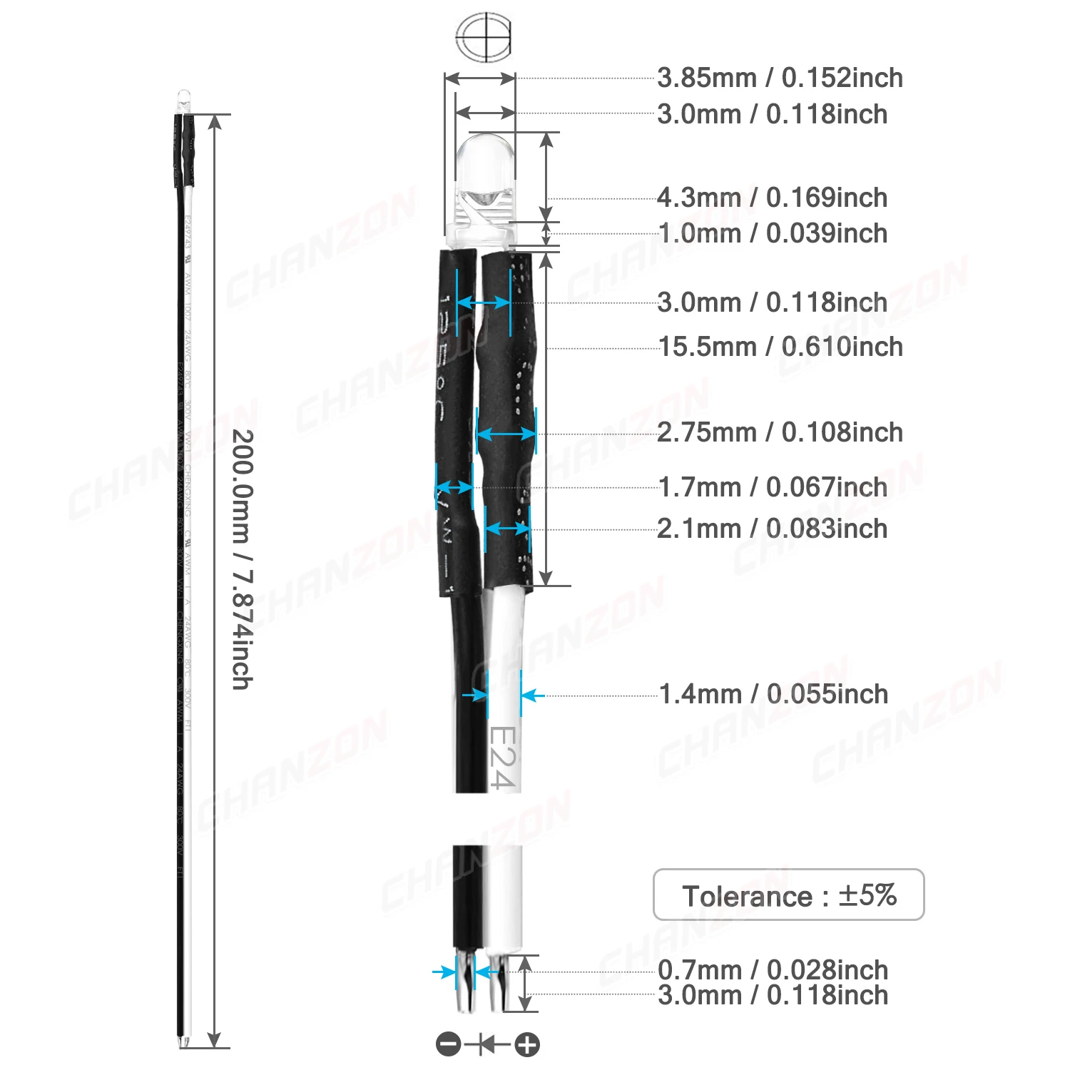 Бренд: CHANZONКоличество: 20 шт./упак.Объектив: диаметр 3 мм/прозрачныйЦвет излучения: теплый белый/красный/зеленый/синий/желтый/оранжевый/УФ/розовыйТок: 20 мАНапряжение: 12 В (его также можно использовать с 3-12 В для различных целей яркости)Полярность: анод (цветной провод) | Катод (черный провод)Интенсивность света: см. Изображение спецификации