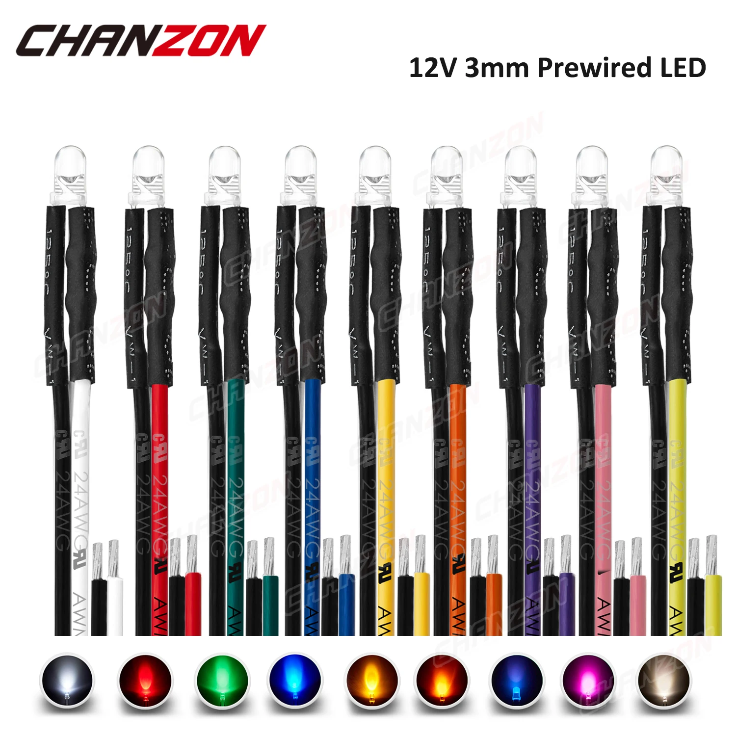 Светодиодные диоды, 20 шт., 3 мм, 12 В, теплый белый, красный, зеленый, синий, желтый, оранжевый, УФ, фиолетовый, розовый, Предварительно Проводные, 5, 9, 12 В, светоизлучающие индикаторы