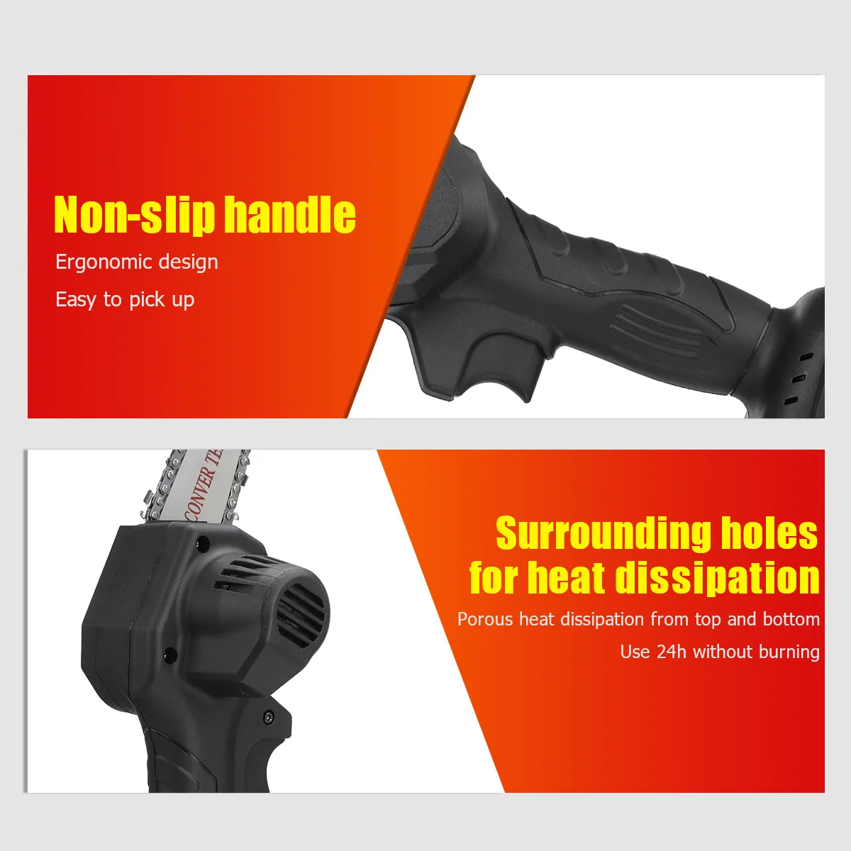 Особенности товара:Цвет: черныйМощность:800 ВтНапряжение батареи: 88VFСкорость цепи: 6 м/сЕмкость аккумулятора:15000 мАч/25000 мАчМатериал изделия: абс + металлМатериал цепи: Высокоуглеродистая стальОсобенности:-Перезаряжаемый Электрический светильник цепной пилы и портативный, без повреждений коры.-Светильник вес тела, светильник и удобный, светильник вес конструкции, долгое время, и не устают руки.-Двигатель из чистой меди, сильная мощность, быстрая резка, повышение эффективности.-Практичная, быстрая скорость, низкое энергопотребление.-Переключатель отличного качества, быстрая и медленная регулировка, понижение скорости.-Интеллектуальная плата управления цепью, защита от перегрузки, для удовлетворения ваших различных потребностей в конструкции.-Хороший инструмент для садоводства-Специальная направляющая пластина, шарик из вольфрамовой стали не нужно смазывать, так что машина уменьшает сопротивление во время работы и уменьшает износ на машине.-Мини-размер можно держать одной рукой.-Высококачественная направляющая цепь, глубокая закалка, более износостойкая, гладкая резка.-Безопасность распиливания, существенно повышает эффективность вашей работы.-Для вырубки и обрезки древесины.-Идеальный инструмент для вырубки отвечает различным потребностям многих ситуаций.Примечание:1. Допускается погрешность в 1-3 см из-за ручного измерения. Перед размещением заказа, пожалуйста, внимательно ознакомитесь со всеми условиями.2. Цвета могут отличаться, так как на дисплее разница, пожалуйста, поймите.