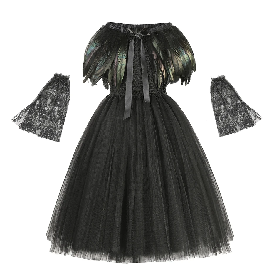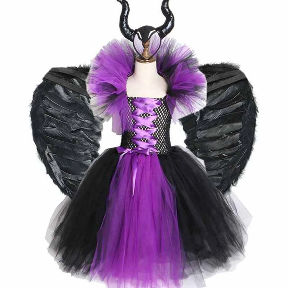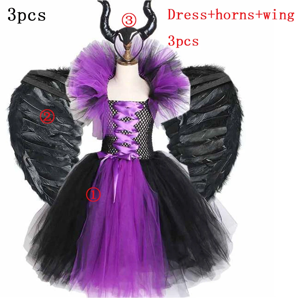 Платье-пачка со злыми и тёмными феями для девочек, платье ведьмы, с рожками, крыльями, малефисент, Детский костюм на Хэллоуин, косплей-вечеринку, нарядное платье дьявола злого