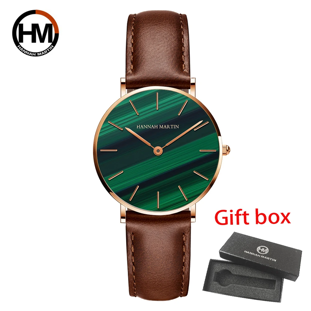 Японские Кварцевые водонепроницаемые женские наручные часы Hannah Martin с сетчатым браслетом из нержавеющей стали и зеленого малахита