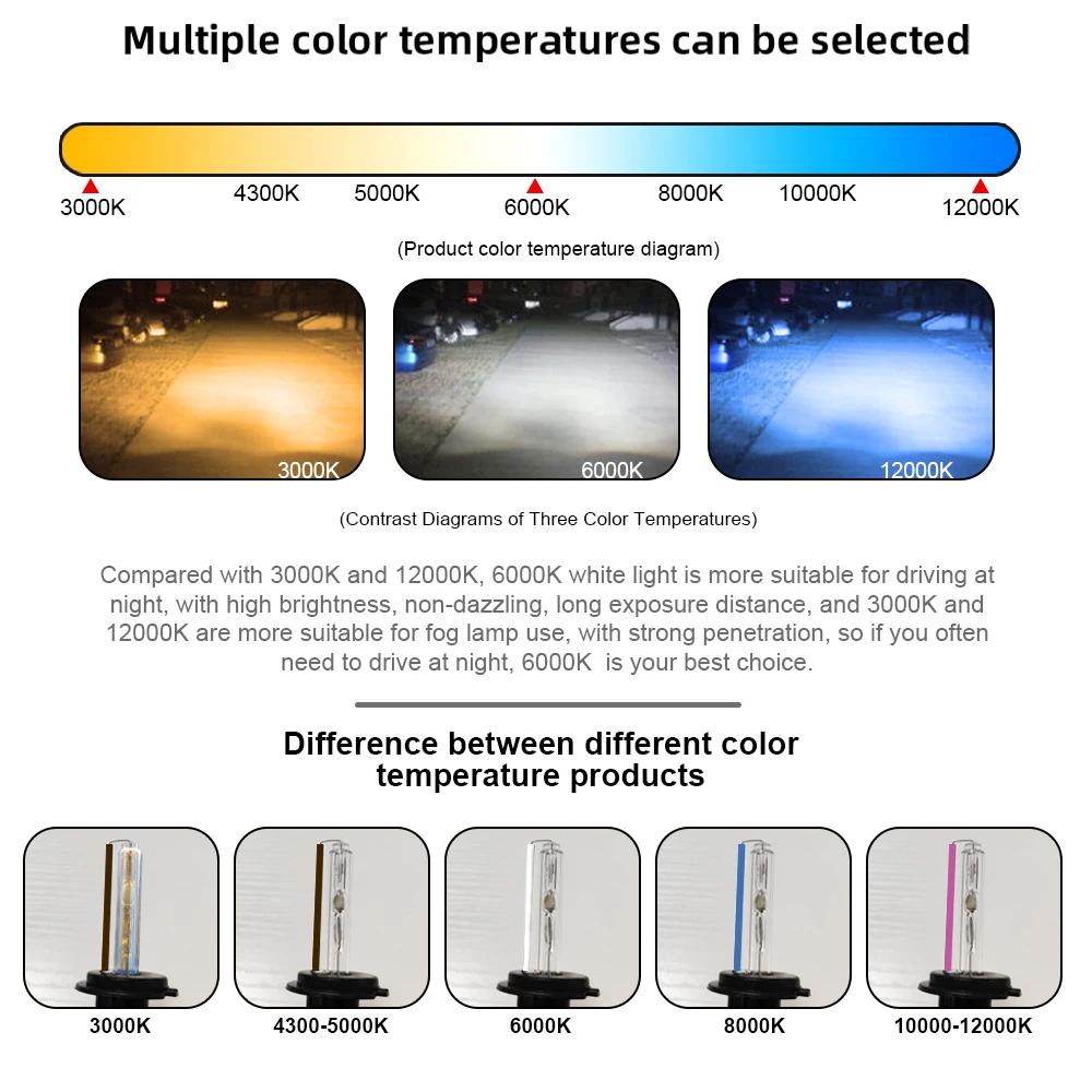 H4/9003/HB2 Hi/Lo9008/H13 Hi/Lo9004/HB1 Hi/Lo9007/HB5 Hi/LoЦветовая температура: 3000K 4300K 5000K 6000K 8000K 10000K 12000K3000K желтого золота4300K белого и желтого цвета5000 К с теплым белым светом6000K холодный белый8000K белого и синего цветаЛучше всего для автомобиля, больше всего яркости для автомобиля!10000K синий12000K темно-синего цвета