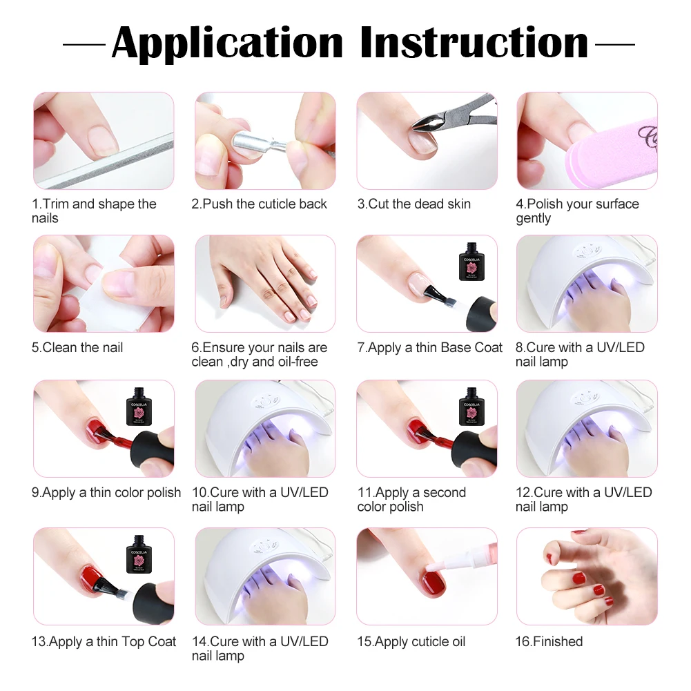-1. Форма ногтя. Слегка смочите поверхность ногтевой пластины. Дезинфицировать.-2. Нанесите базовый слой основы от кутикулы до свободного края (не забудьте запечатать край ногтя). Высушите ногти под светодиодный или УФ-светильник в течение 1-2 минут.-3. Нанесите тонкое пальто отмачиваемого геля на выбор. Свободный край крышки. Лечение: светодиодная или УФ-лампа в течение 2-3 минут-4. Повторите 2-е тонкое покрытие отмачиваемого гель-лака на ногти. Лечение под светодиодный или УФ-lamp2-3 минут.-5. Нанесите верхнее пальто. Свободный край крышки. Лечение: УФ или Светодиодная лампа в течение 1-2 минут-6. Удалите липкий остаток на ногтях с помощью очищающего средства. Затем нанесите питающее масло кутикулы для увлажнения влаги в кутикулу и кожу вокруг ногтя.