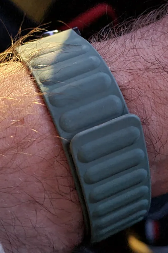 Внешний вид: 10/10. Небольшое усилие на отрыв и большое на разрыв, т.е. в повседневной эксплуатации часы слетать с руки не должны, но будем посмотреть. Нельзя цепляться за половинку ремешка, т.к. как я уже писал, усилие на отрыв небольшое и можно сорвать часы с руки. По итогу одного дня, раздражения кожи нет. Из-за того, что на руке радиус изгиба внутренней половинки меньше чем внешней, возникает несоосность магнитов и в итоге в одном месте один "внутренний" магнит между двумя "внешними" и прилипания в этом месте нет, но это абсолютно не критично, на крепкость соединения не влияет, на внешний вид влияния почти нет. Сложнее надевать на руку в сравнении с нейлоновыми ремешками с липучкой. При этом проще надевать ремешок на часы.