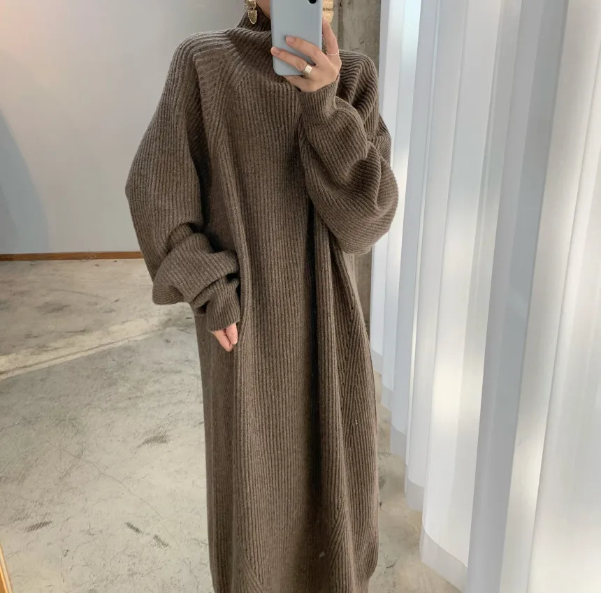Женское шерстяное платье в полоску, длинное вязаное Платье-Свитер оверсайз с высоким воротником, в стиле ретро, зима 2021