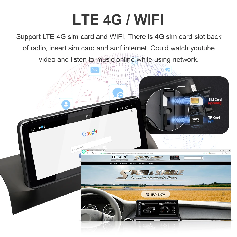 > Поддержка LTE 4G и Wi-Fi, есть 4G слот для sim-карты сзади радио. Вставьте sim-карту и занимайтесь серфингом в Интернете, можете смотреть видео на youtube и слушать музыку онлайн во время использования сети. 4G sim-карта опционально, вы можете купить sim-карту на вашем местном рынке.