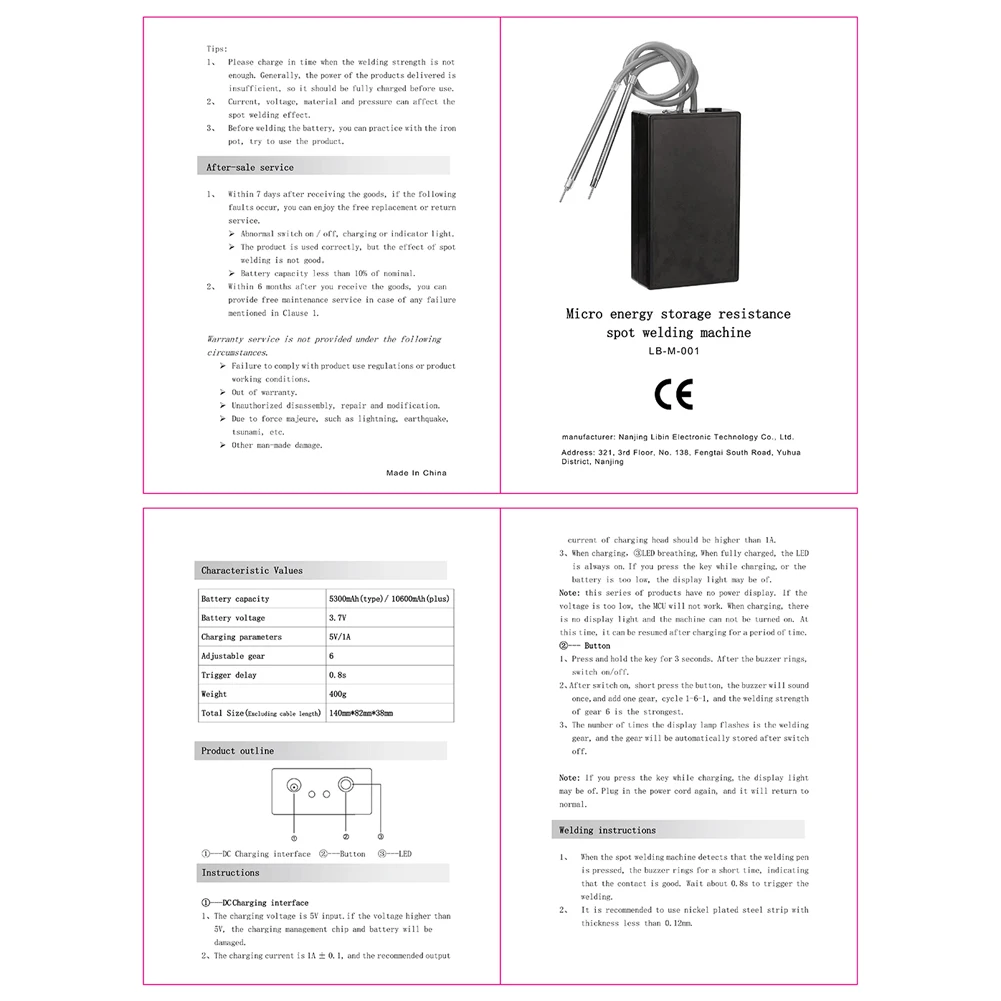 Это своего рода высококачественный аппарат для точечной сварки, компактный размер, легкий и портативный, легко положить в карман и носить с собой. 6 передач регулируемой выходной мощности, 1-6-1 циркуляция, более точная Сварка. Медный стержень ручки с 10awg мульти-силиконовой проволокой, гуманизированный рукав для безопасного использования. Поставляется с высокой скоростью литиевой батареи, и она может непрерывно сваривать тысячи точек на 0,1-0,15 мм никелевый лист после полной зарядки. Вы можете попробовать. Особенности:Компактный размер, легкий и портативный, легко положить в карман и носить с собой.Простота в использовании, одна кнопка для включения/выключения, очень удобно.Тонкая работа с стабильной производительностью, может обеспечить длительный срок службы.Конструкция с низким энергопотреблением, не нужно беспокоиться о том, что аккумулятор не будет работать при отключении.6 передач регулируемой выходной мощности, 1-6-1 циркуляция, более точная Сварка.Долгое время нажмите для загрузки, Это покажет последний использовать шестерни, короткое нажатие один раз, чтобы добавить одну шестерню.Само функцией детектора, Автоматический триггер после сварочный электрод обратитесь к никелевый лист, 0,8 s время отклика.Улучшенное управление питанием и разработка программного обеспечения не сбрасывают и не возвращают к нулю во время сварки.Оснащен индикаторным светильник, зарядкой вспышки, полной перезарядкой в режиме ожидания.Самонесущий с модулем управления перезарядкой, легко зарядить ваш мобильный телефон через следующий usb-кабель.Поставляется с высокой скоростью литиевой батареи, и она может непрерывно сваривать тысячи точек на 0,1-0,15 мм никелевый лист после полной зарядки.Медный стержень ручки с 10awg мульти-силиконовой проволокой, гуманизированный рукав для безопасного использования. Характеристики:Наименование: аппарат для точечной сваркиБатарея: 1*5 В, 5300 мАч литиевая батарея(В комплекте)Цвет: золотой, серебряный, розовое золото(Опционально)Шестерни: 1-6 передачТолщина сварки: 0,1-0,15 ммРазмер изделия: 140*80*40 мм/5,51*3,15*1,57 дюймовВес изделия: 355 г/12,52 унцийРазмер посылка: 170*115*90 мм/6,69*4,53 * 3.54inПосылка Вес: 423 г/14,92 унции Упаковочный лист:1 * аппарат для точечной сварки