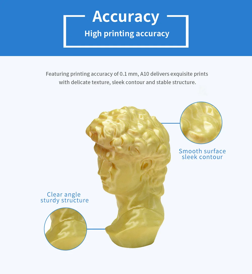 1. Классическая комбинация синего и черного цветов придает торжественность и простоту.2. С его объемом сборки 220*220 * 260мм ³, A10 делает лучшее из строительной платформы и дает вам полный обзор деталей печати.3. Благодаря точность печати 0,1 мм, A10 поставляет тонкий узор с приятной текстурой и гладким контуром и устойчивую конструкцию.4. V-образные колеса и рельсы на каждой оси, изготовленные из износостойкого алюминиевого профиля, могут в большой мере уменьшить шум печати.5. A10 поставляется с пультом управления с открытым исходным кодом GT2560, обеспечивая неограниченное пространство для изменения прошивки и повозки с вашим принтером.