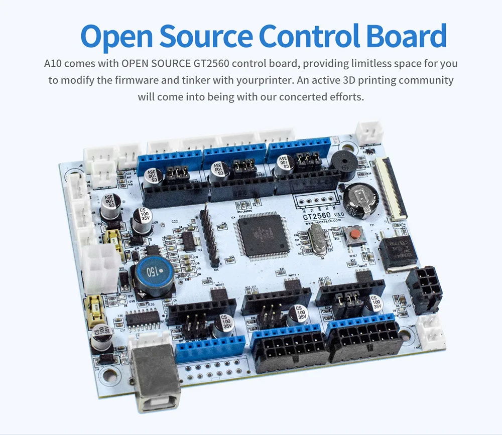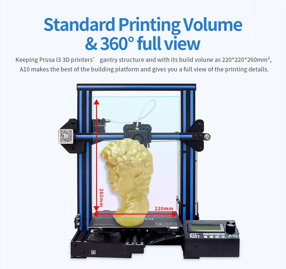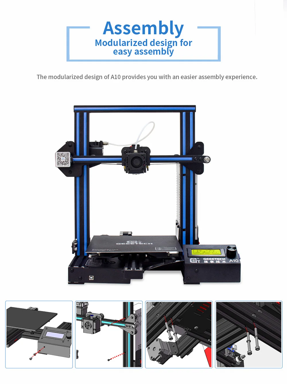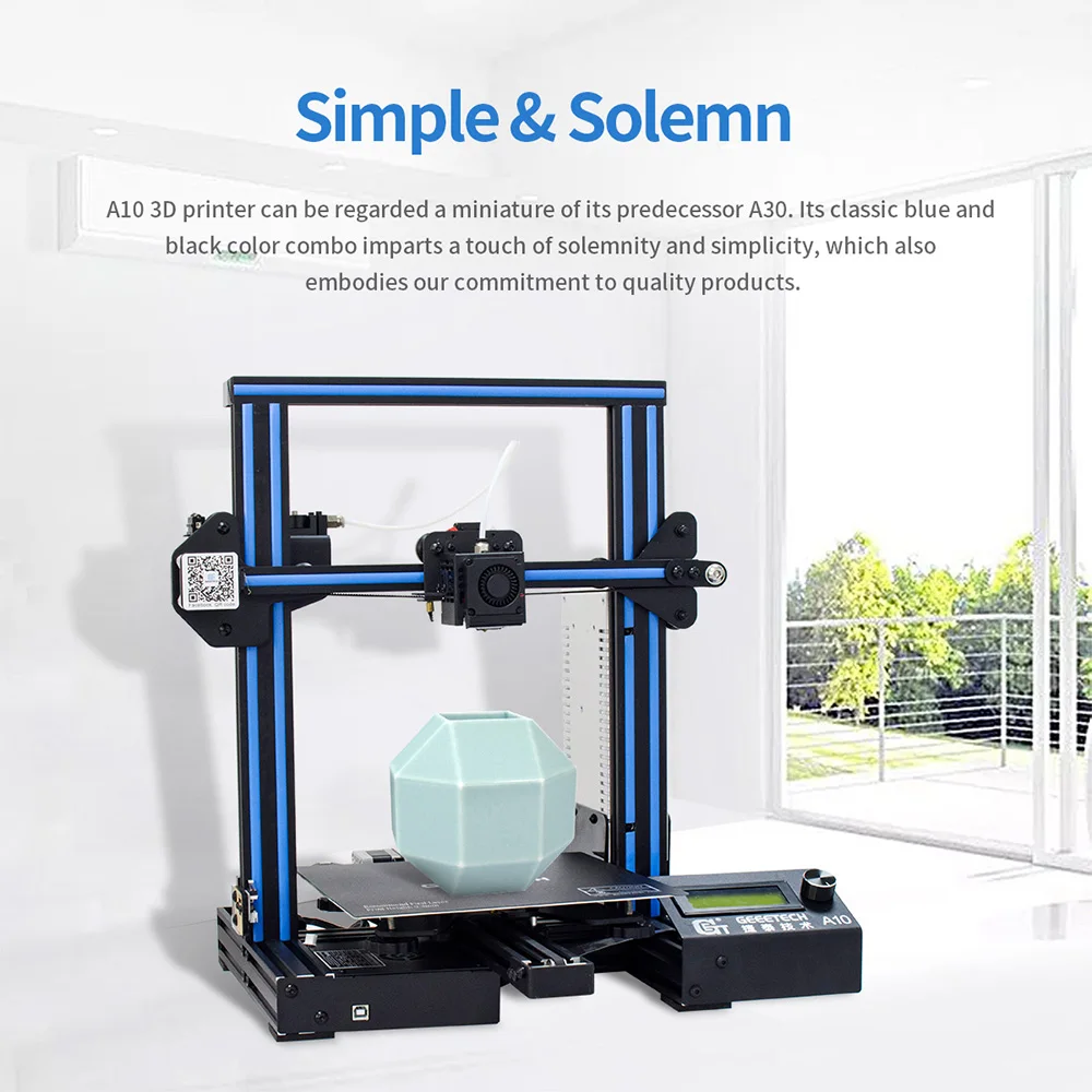3D-принтер Geeetech A10 с открытым исходным кодом GT2560-надежный, экономичный и простой в сборке. Стабильная работа, она нацелена на предоставление пользователям качественной печати и удовлетворительного опыта печати.3D-принтер A10 может быть расценен как миниатюрный его предыдущий A30. Классическая комбинация синего и черного цветов придает ощущение торжественности и простоты, что также воплощает нашу приверженность качественной продукции. Модульная конструкция обеспечивает вам более легкий опыт сборки.Сохраняя портальный каркас Prusa I3 3D Printers и его объем сборки составляет 220*220 * 260мм ³, A10 делает лучшую строительную платформу и дает вам полный обзор деталей печати. Его хорошо разработанный экструдер значительно снижает риск засорения или протекания. Конструкция боудена экструдера делает печатающую головку слегка и стабильно двигаться, что значительно повышает эффективность печати. V-образные колеса и рельсы на каждой оси, изготовленные из износостойкого алюминиевого профиля, могут в большой мере уменьшить шум печати и предложить вам тихую среду 3D печати.