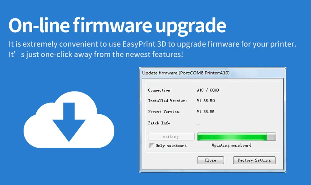 Операционная система: Windows, MAC, LinuxПрограммное обеспечение управления: EasyPrint 3D, Repetier-Host, упрощает 3D, Cura, Slic3r и т. Д.Удаленное приложение: приложение EasyPrint 3D (с дополнительным модулем 3D WiFi)Формат файла:. STL, G.code