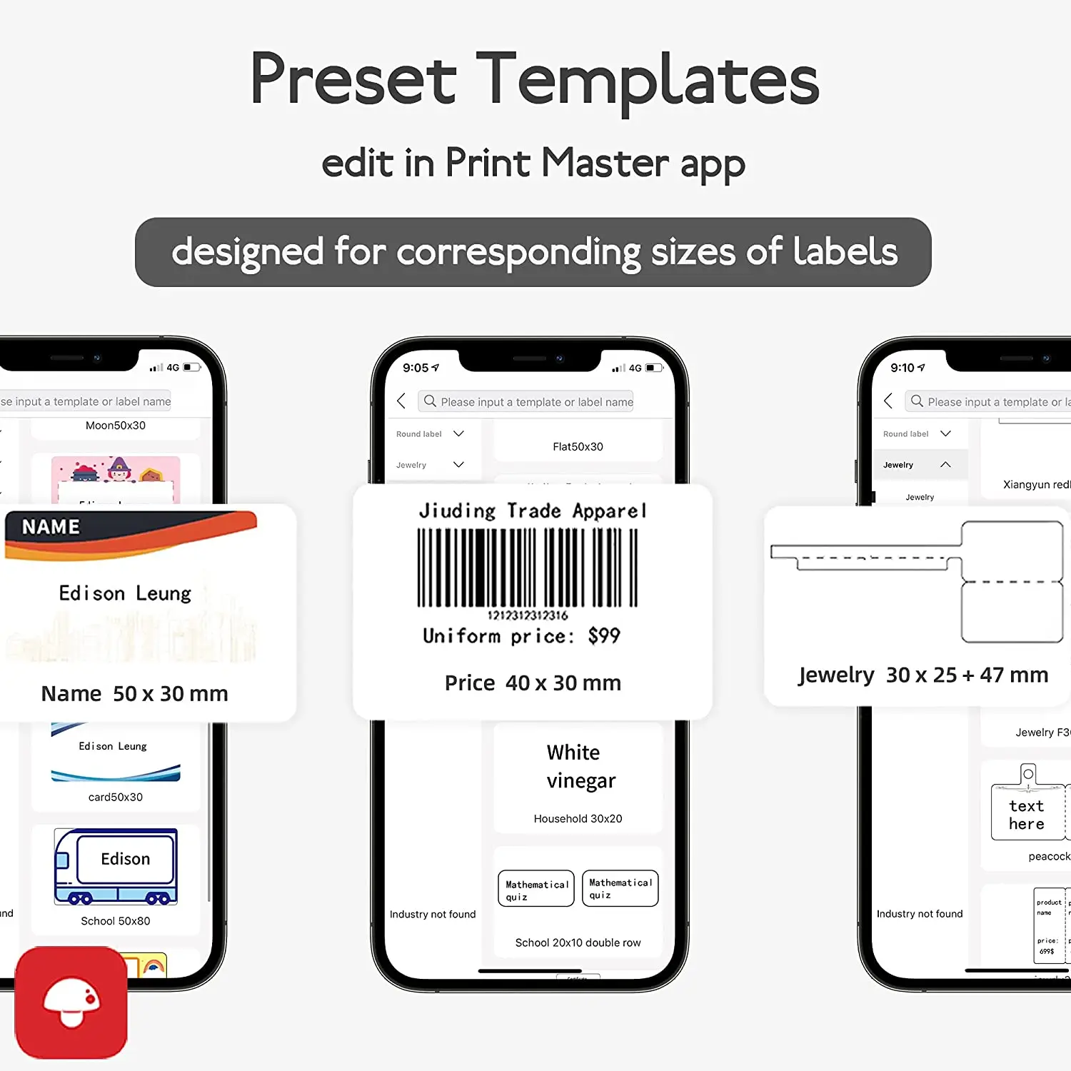 Приложение «PRINT MASTER» этого беспроводного производителя этикеток bluetooth поставляется с большим количеством готовых к использованию шаблонов этикеток для удобной печати.