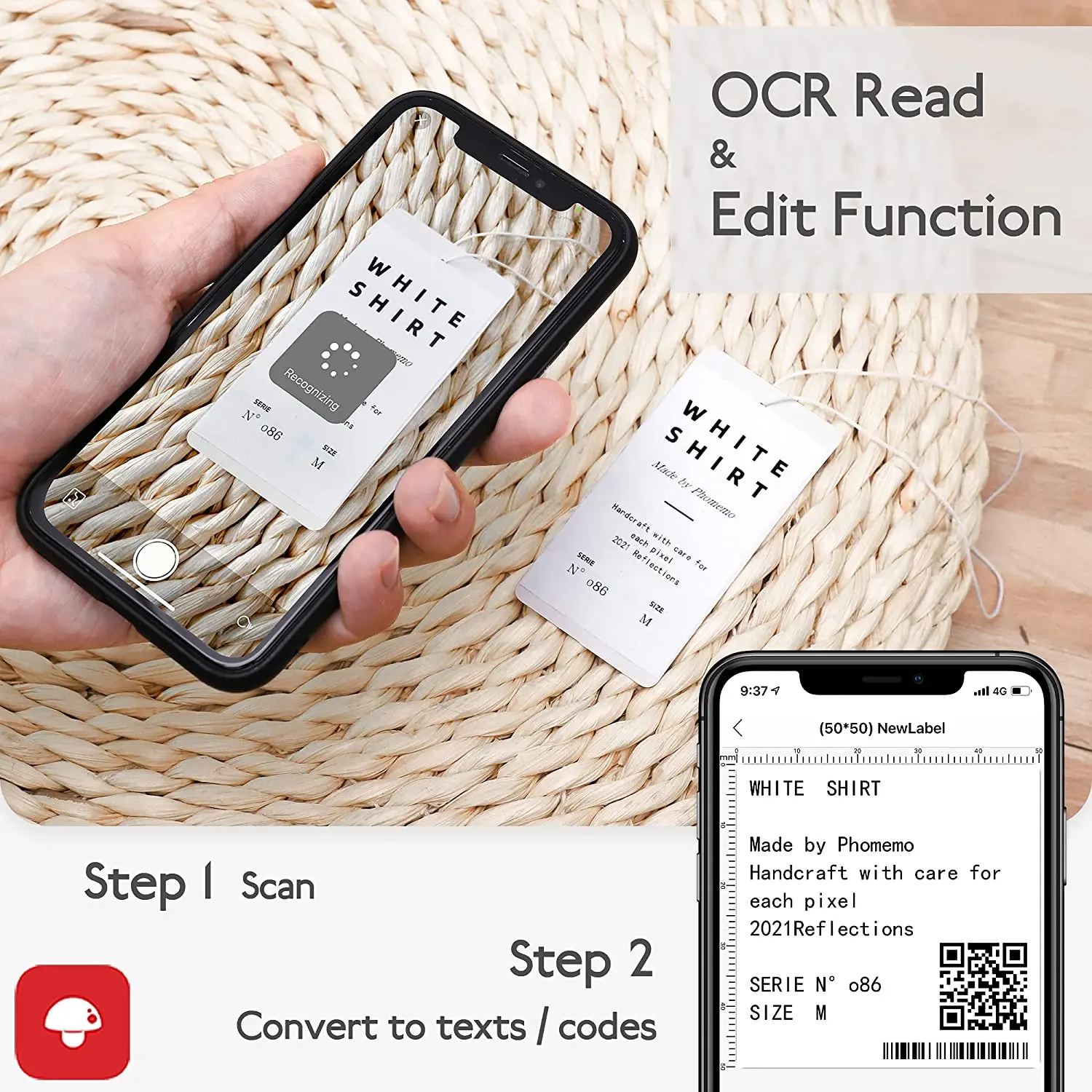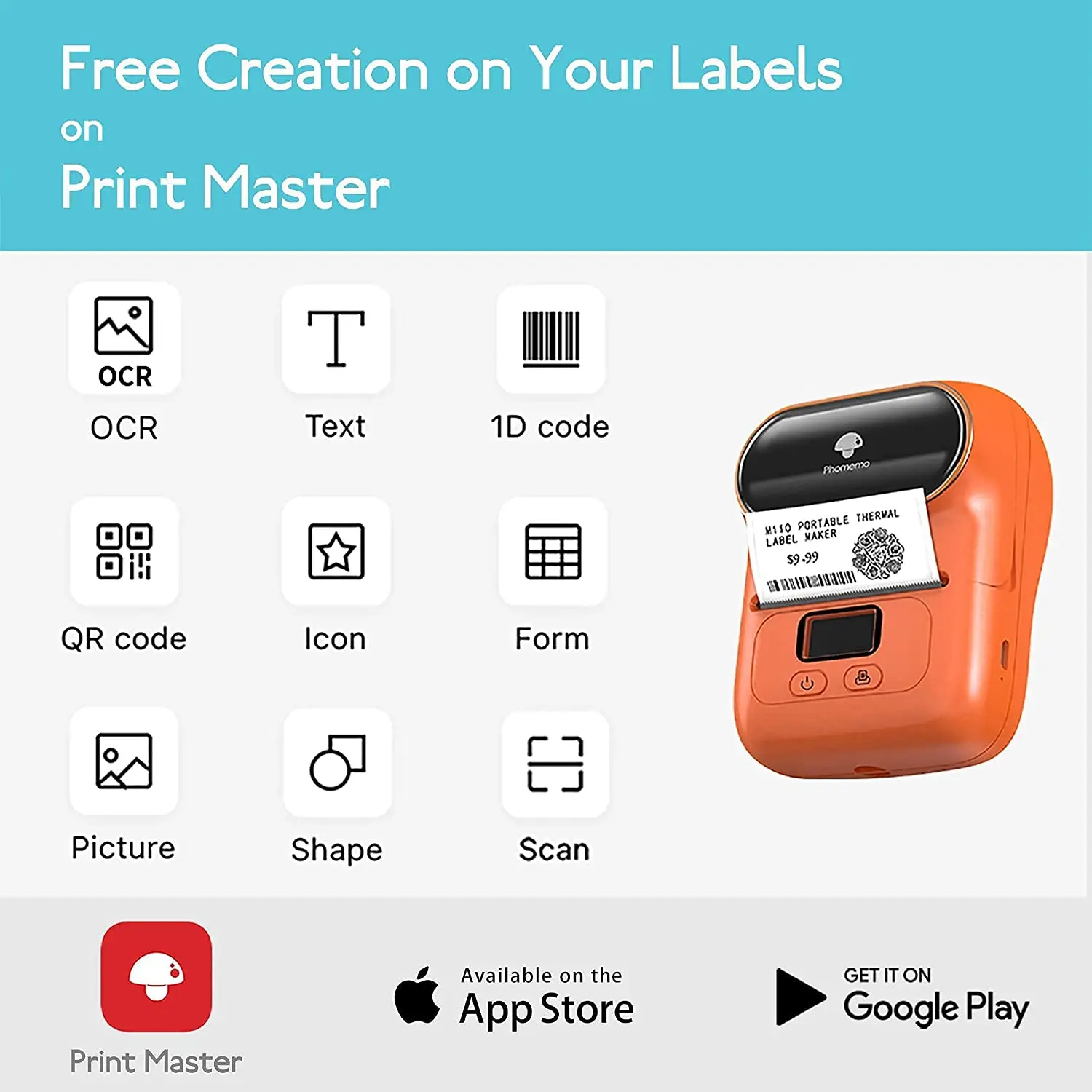 Многофункциональная функция- Функция OCR read и adit, импорт excel, голосовая запись или код, 1D код, значок, форма, печать изображений, функция сканирования и пользовательский креатив. Бесплатное приложение может получить его в apple store или google play.