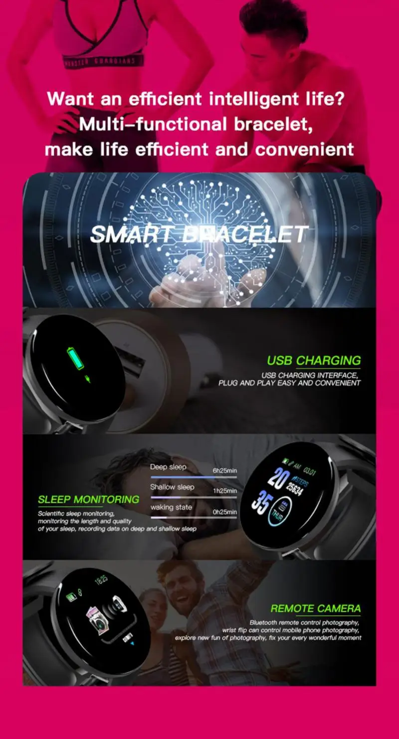 IP65 Водонепроницаемый для повседневной жизни, мульти-спортивный режим, подходит для занятий спортом на открытом воздухе. Автоматически записывает ежедневный шаг движения и данные о калориях.