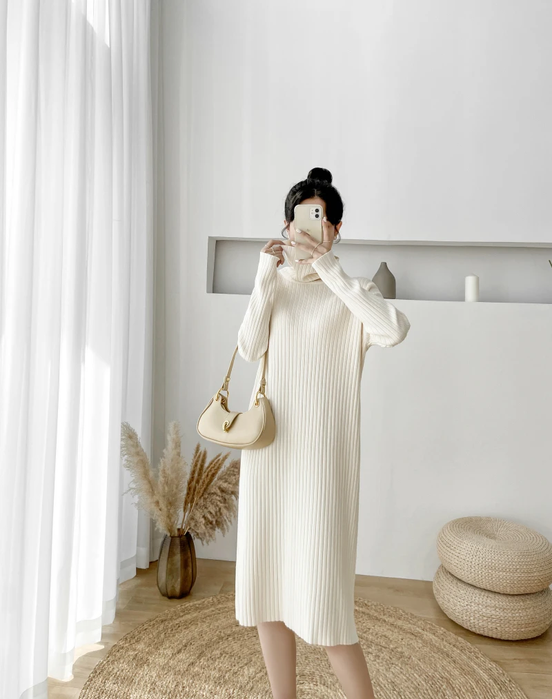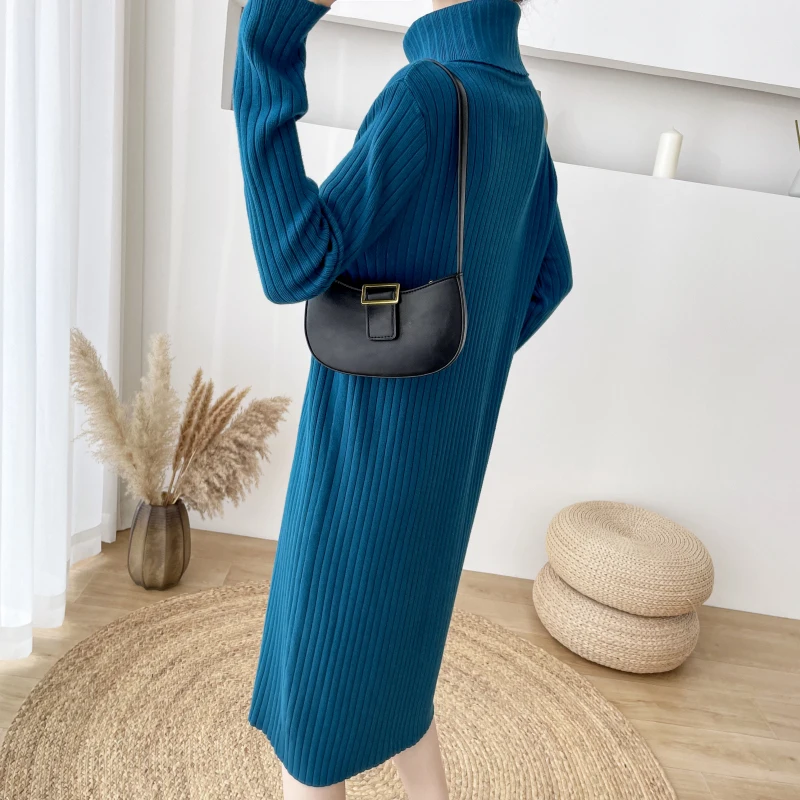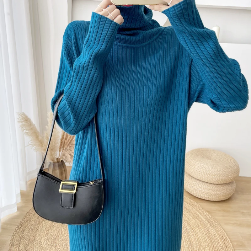 Женское трикотажное платье-водолазка с длинным рукавом и естественной талией