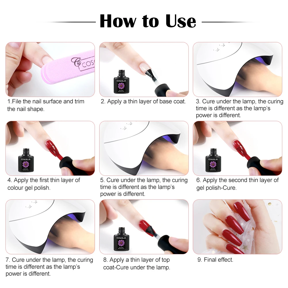 -1. Форма ногтя. Слегка смочите поверхность ногтевой пластины. Дезинфицировать.-2. Нанесите базовый слой основы от кутикулы до свободного края (не забудьте запечатать край ногтя). Высушите ногти под светодиодный или УФ-светильник в течение 1-2 минут.-3. Нанесите тонкое пальто отмачиваемого геля на выбор. Свободный край крышки. Лечение: светодиодная или УФ-лампа в течение 2-3 минут-4. Повторите 2-е тонкое покрытие отмачиваемого гель-лака на ногти. Лечение под светодиодный или УФ-lamp2-3 минут.-5. Нанесите верхнее пальто. Свободный край крышки. Лечение: УФ или Светодиодная лампа в течение 1-2 минут-6. Удалите липкий остаток на ногтях с помощью очищающего средства. Затем нанесите питающее масло кутикулы для увлажнения влаги в кутикулу и кожу вокруг ногтя.