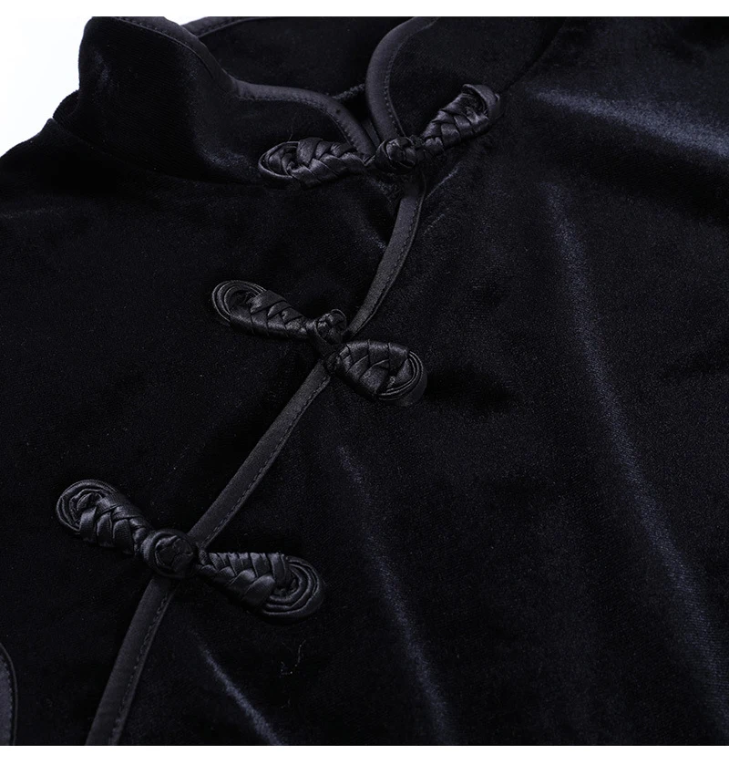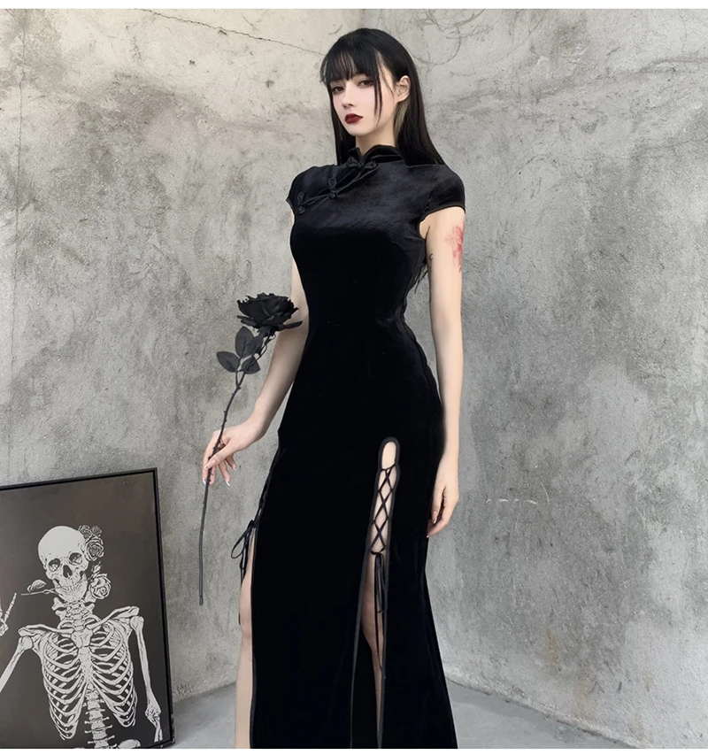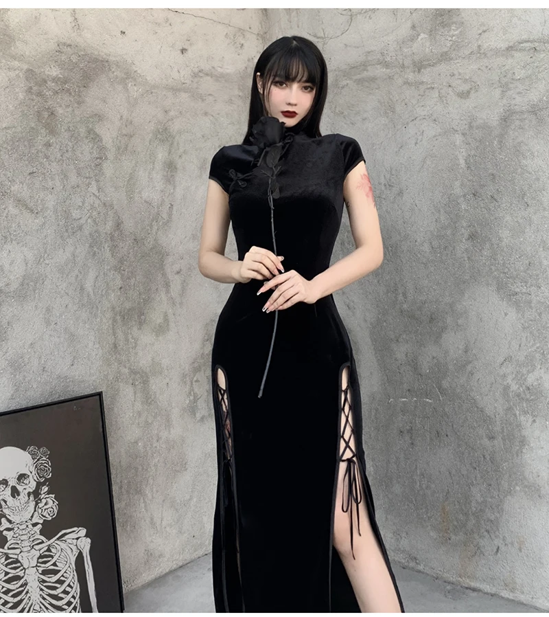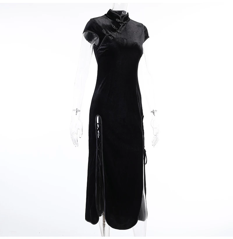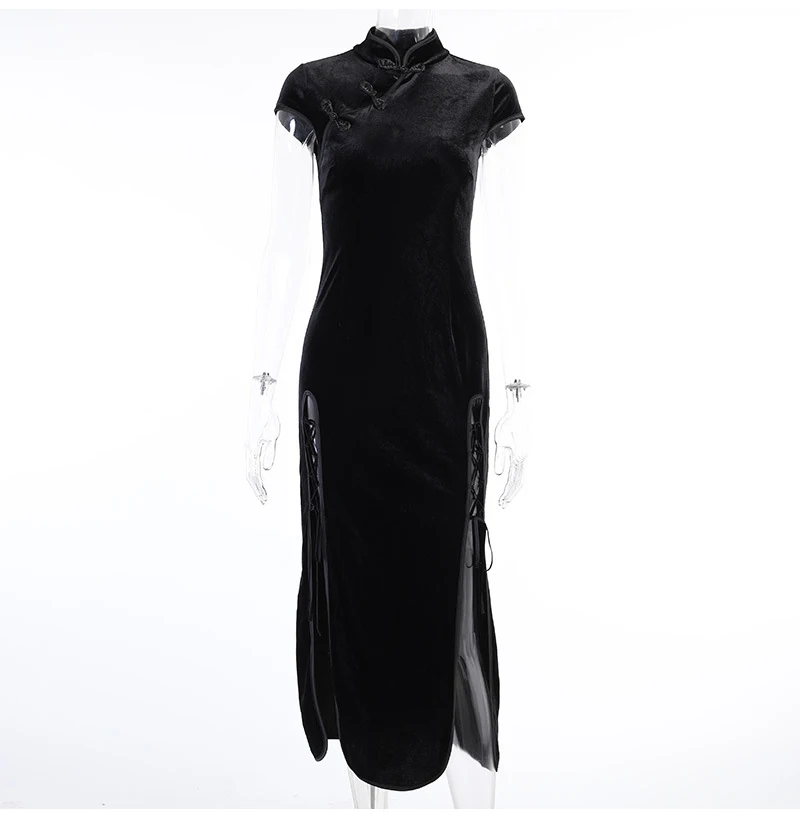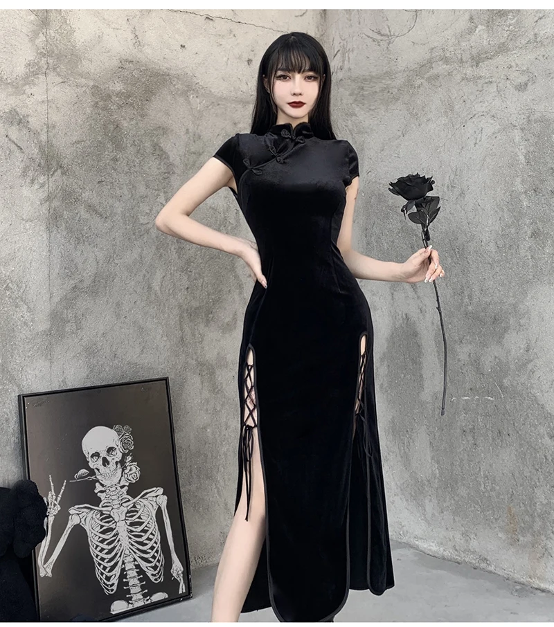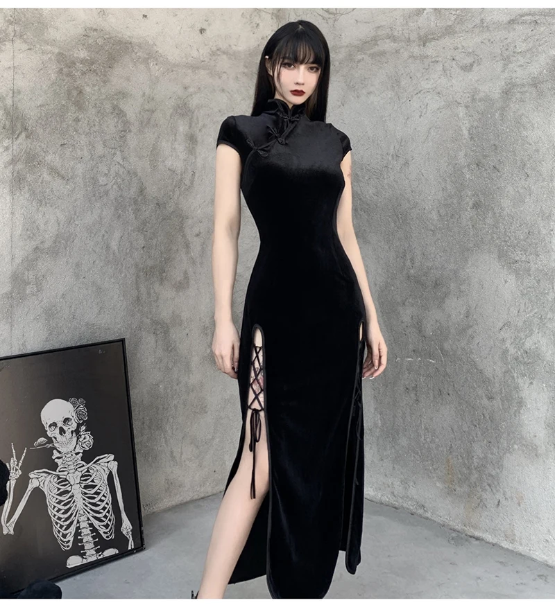 Женское бархатное платье-Ципао, винтажное облегающее платье черного цвета с завязками, вечерняя одежда в готическом стиле для вечеринок