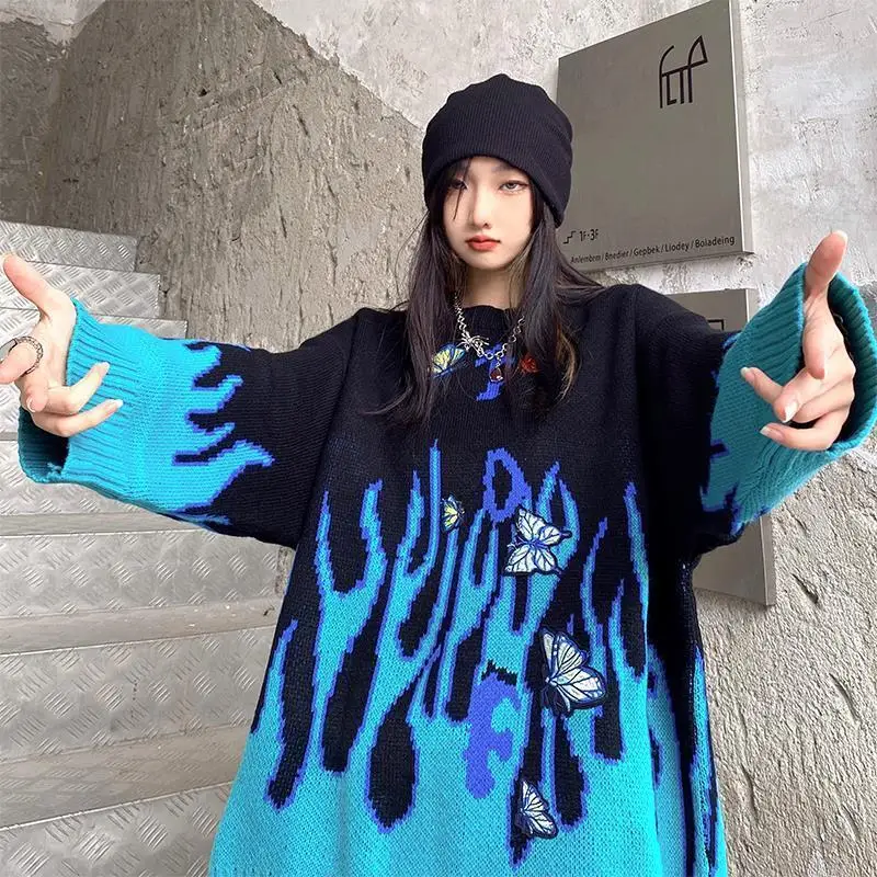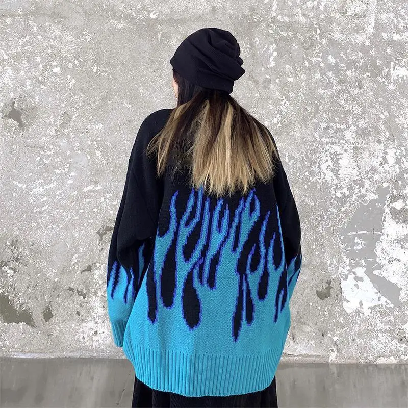 Женский жаккардовый свитер, пуловер в стиле хип-хоп с принтом пламе...