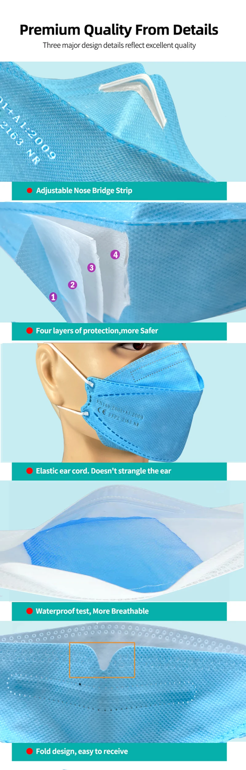 Примечание: маска напечатана "FFP2 NR EN 149:2001 + A1:2009 CE 2163" для взрослыхПреимущества масок для рыб:①Comfortable в носке.②Хороший эффект фильтрации, особенно для очень мелких частиц и пыли.③ Подходит для различных форм лица.④ Высококачественный защитный эффект. Его защитный эффект такой же, как маска KN95 и Европейская маска FFP2.Applicable применяется в различных средах, где защитные маски необходимо носить в течение длительного времени, таких как фабрики, школы, компании, торговые центры, песчаные бури, строительные площадки, больницы, парки и т. Д.