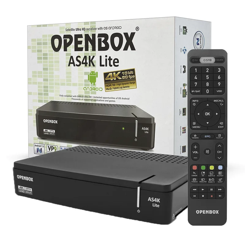 Спутниковый Android ресивер Openbox AS4K Lite построен на основе высокоскоростного 4-х ядерного процессора HiSilicon и работает под управлением операционной системы Android 7.0 (Nougat). Модель оснащена спутниковым тюнером формата DVB-S2X с поддержкой Multistream и T2MI, картоприемником, Ethernet контроллером, USB портами версии 2.0. Оперативная память составляет 1ГБ, а флеш память 8Гб.