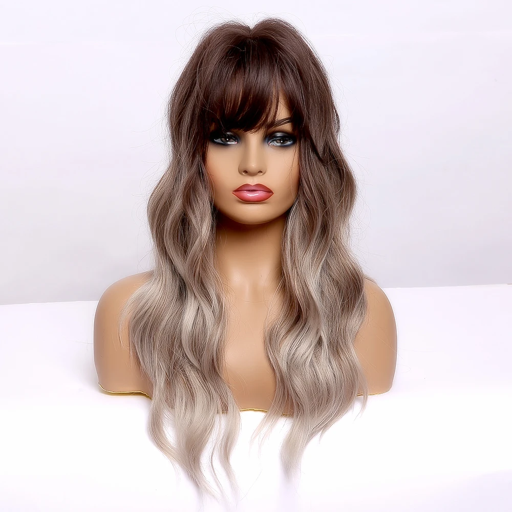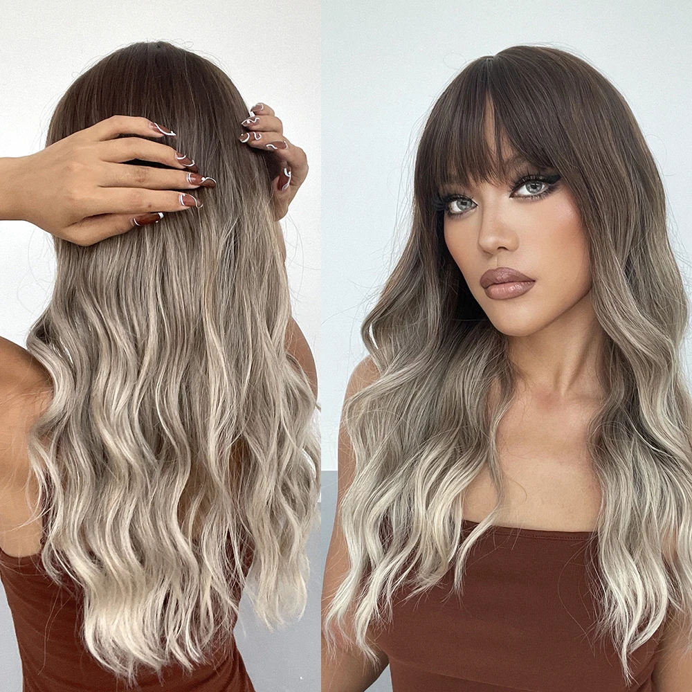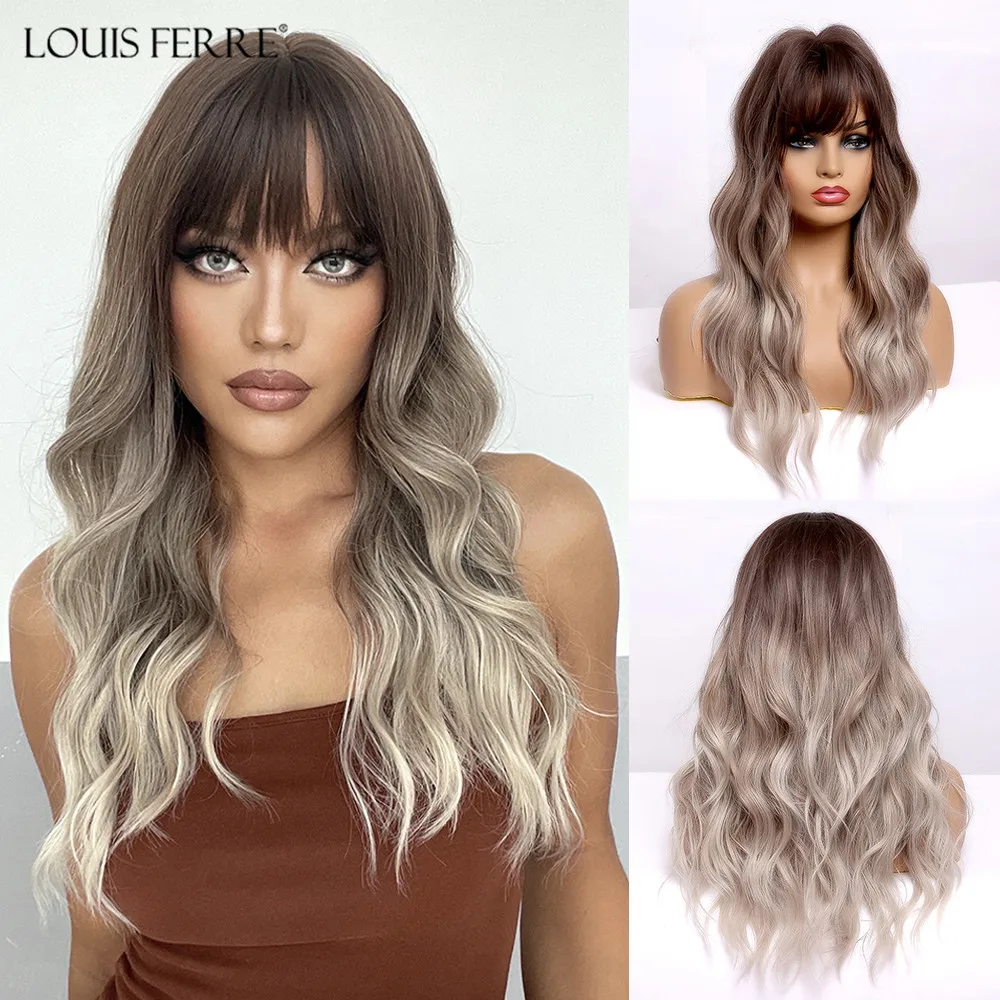 # Луи Ферре длинные волнистые синтетические волосы парики повседневные/вечерние Омбре коричневые светлые парики с челкой для женщин Термостойкое волокно #