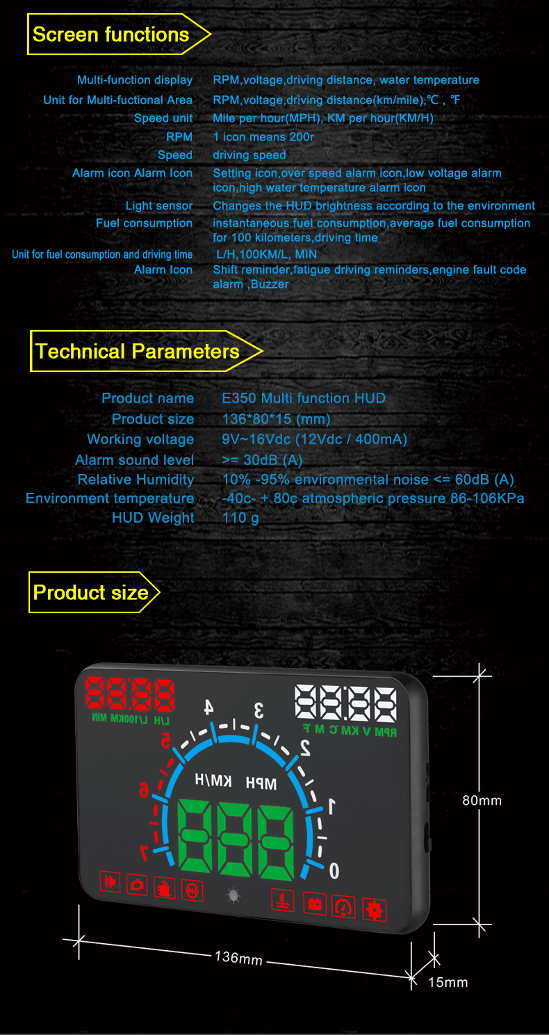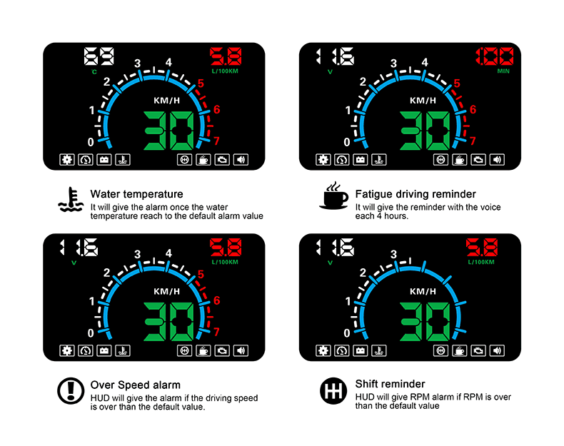 6. Богатое содержание: скорость, об/мин, температура воды, напряжение, мгновенный расход топлива, средний расход топлива, измерение расстояния вождения, напряжение, напоминания о смене, напоминания о усталости вождения, Сигнализация низкого напряжения, сигнализация с высокой температурой воды, сигнализация с превышением скорости, сигнализация неисправности двигателя, устранение кода неисправности, свободное переключение между километрами и милями.