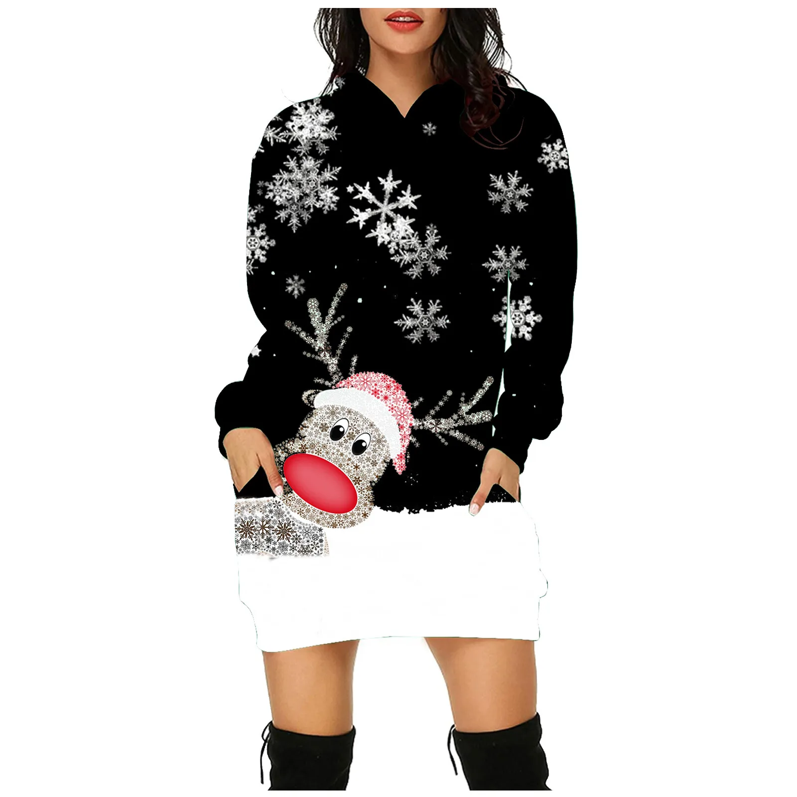 3XL осенне-зимние свободные рождественские платья с длинным рукавом, женская модная толстовка с капюшоном, платье-свитшот с длинными рукавами и карманами на бедрах