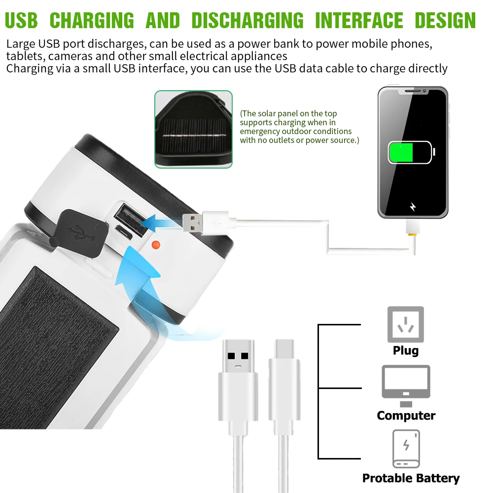 1. Перезаряжаемый USB и светильник на солнечных батареях: походный светильник можно заряжать через порт micro USB с полной батареей. Солнечная панель на верхней части поддерживает зарядку при аварийных условиях на открытом воздухе без розеток или источника питания.