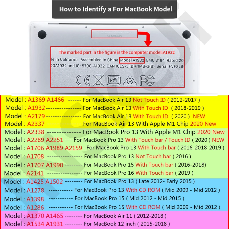 Уведомление: это очень важно, Уважаемый клиент, пожалуйста, дважды проверьте номера своей модели в приведенном ниже списке перед заказом любых чехлов для ноутбуков (вы всегда можете найти свой номер модели на обратной стороне, пожалуйста, выберите размер в соответствии с моделью). Эти жесткие чехлы предназначены только для Macbooks; Пожалуйста, не используйте для других ноутбуков. Если вы не уверены в номере вашей модели, вы всегда можете связаться с нами. Мы будем рады помочь Вам найти подходящий чехол.
