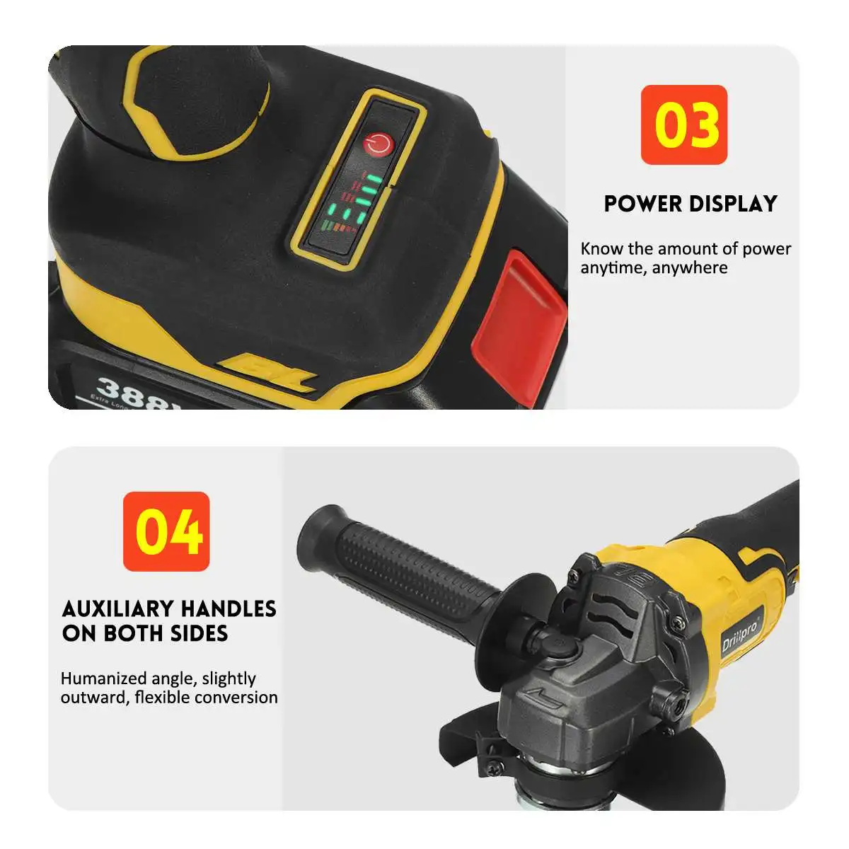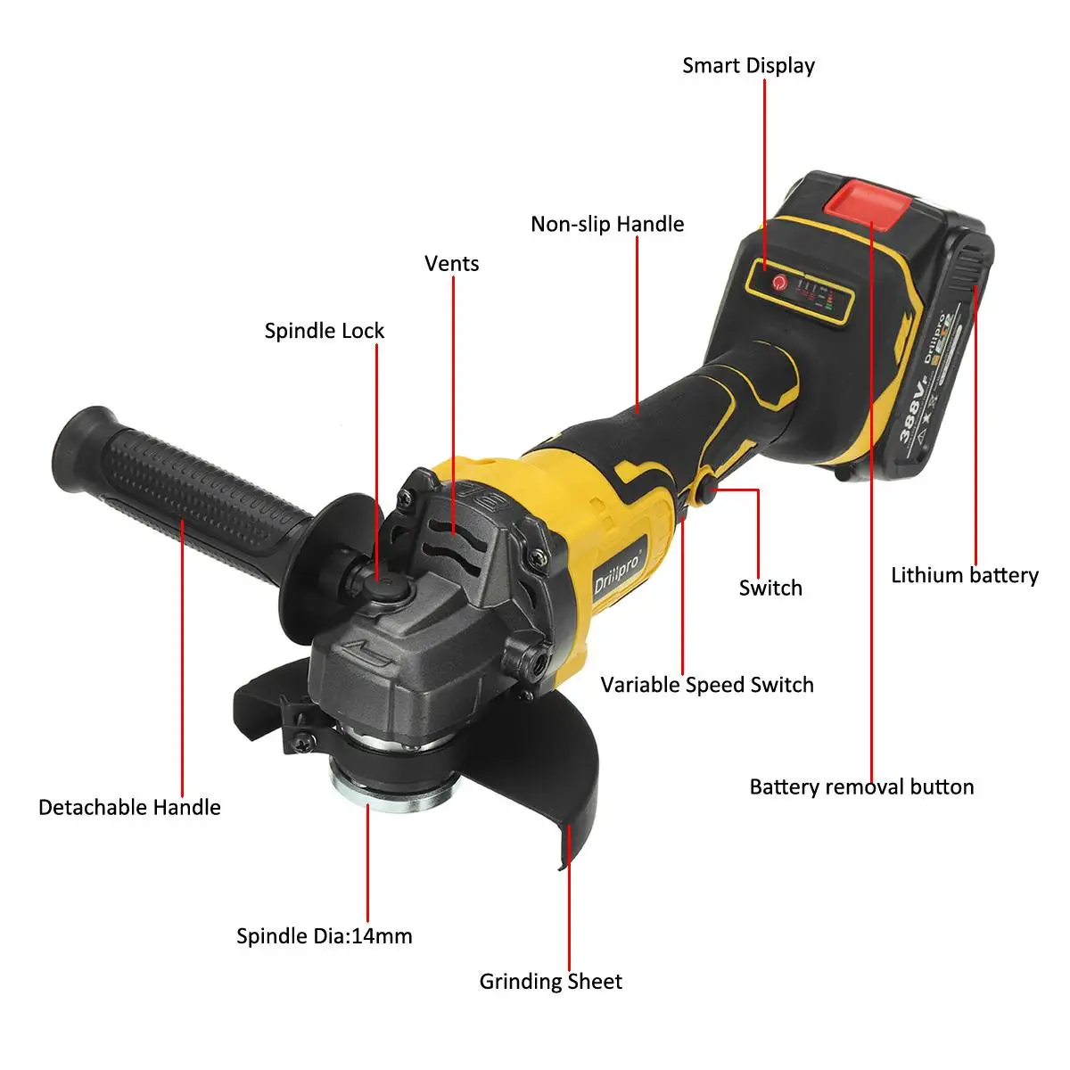 Особенности -Интеллектуальный дисплей, отображение неисправностей машины в режиме реального времени.-Маленькая ручка, светильник вес, небольшой на открытом воздухе деятельности.-Съемная защитная сетка предотвращает попадание мусора и продлевает срок службы.-Медный сердечник, высокая мощность, защита от перегрузки, предотвращает сжигание машины.-Супер тепловыделение, трехмерное тепловыделение, защита двигателя.Посылка в комплекте 1 х угловая шлифовальная машина1 или 2 батареиЗарядное устройство-1 шт.1 x ручка1 х перегородка1 х гаечный ключ1 х Руководство