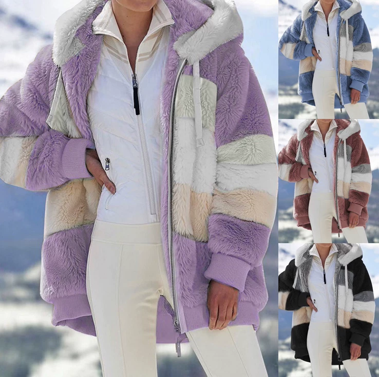 Зимняя женская куртка, теплая плюшевая Повседневная Свободная куртка с капюшоном, разноцветная зимняя верхняя одежда в стиле пэчворк, Женская парка на молнии с искусственным мехом, пальто