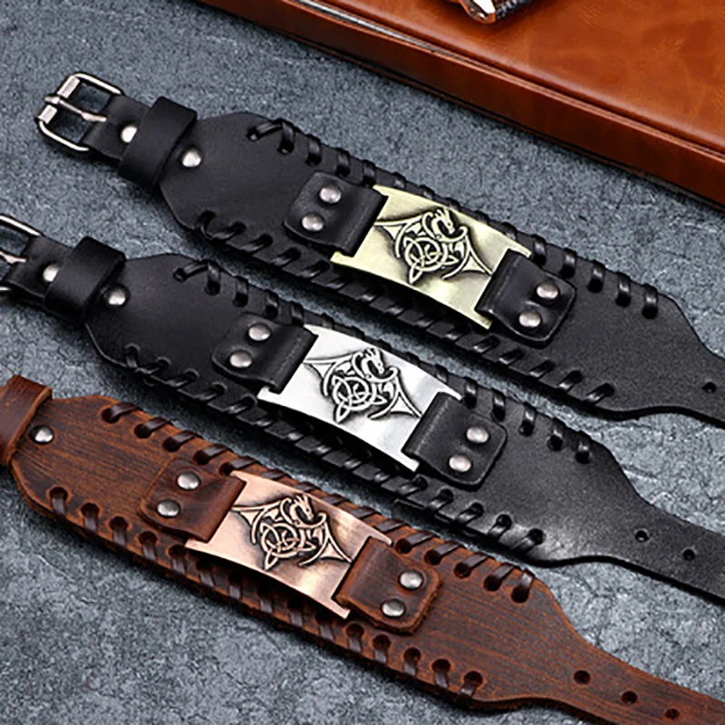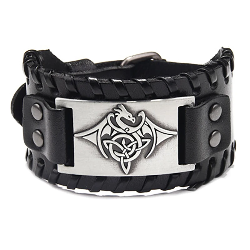 Кожаный браслет в стиле панк, черный тотем, скандинавский Викинг, с летающим драконом, мужской классический модный плетеный браслет из сплава, широкий браслет, ювелирные изделия